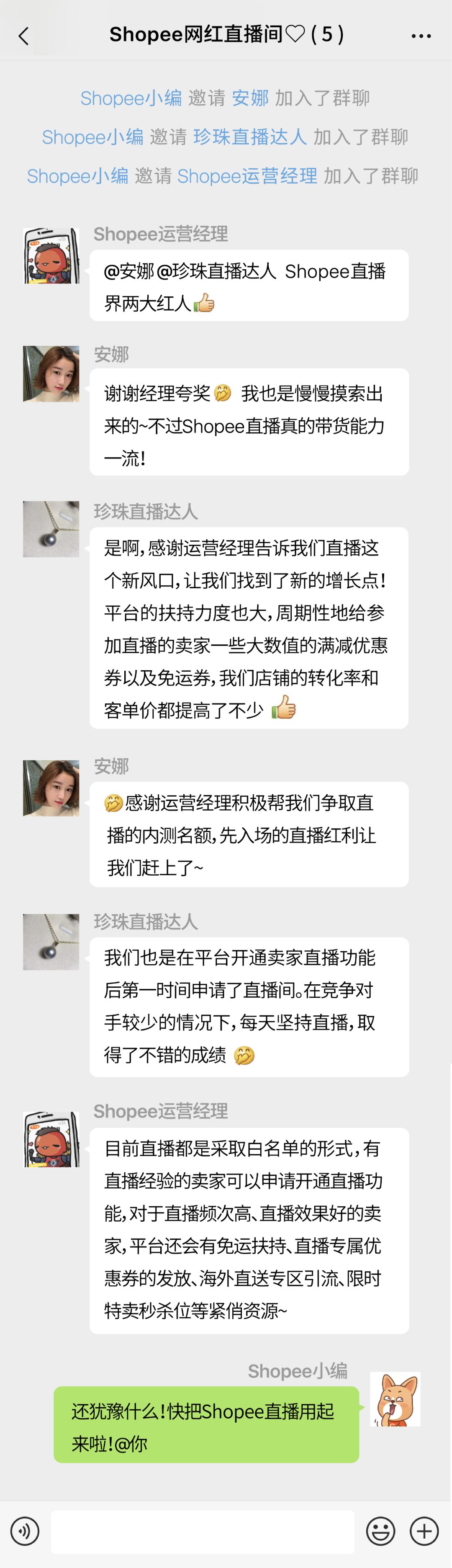 既有美女主播又有珍珠直播达人,Shopee直播界人才辈出!看完这波安利,你是不是迫不及待想把Shopee直播用起来?别急,“上车”之前给你一个跟Shopee红人近距离接触的机会!你已被小编拉进Shopee直播群聊!