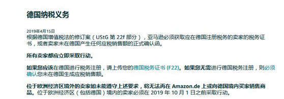 10月1日起,德国站或将迎来新一轮封号 自今年1月德国新修订增值税法案生效以来,相继有不少亚马逊德国站的卖家因VAT问题被封号。船长BI获悉,根据该法案的规定,亚马逊等电商平台必须获取应在德国注册税务的卖家的税务证书(即德国F22税务证书,德语名称为“Bescheinigung nach §22f UStG”),或者卖家未在德国生产任何应税销售额的正式确认函,以确认卖家是否符合增值税合规要求。 (图源亚马逊公告) 卖家向亚马逊提供税务证书的截止日期 1、欧盟境外的卖家:必须在2019年3月1日前提供德国税务证书(在2月28日前已经提交税务证书的申请的可延期至4月15日); 2、欧盟境内的卖家:提供税务证书的最后期限为2019年10月1日。 此外,船长BI还了解到,亚马逊在前两周就已经发布过关于德国站VAT的相关公告,通知所有卖家必须在2019年10月1日前上传德国税务证书或提交申报,否则将无法在亚马逊德国站继续销售并向当地买家配送商品。 满足以下其中一个条件的卖家将受到影响 1、在德国设立公司,进行贸易往来的; 2、无论是使用亚马逊FBA还是海外仓,库存在德国或者通过德国本地发货的; 3、库存在欧盟以外的国家,向德国销售商品,且达到德国远程销售额10万欧元的。 卖家申请税务证书的几个操作步骤 1、访问德国税务机关的网站:点此访问; 2、下载申请表:点此下载。 如下图: (图源税务证书申请表) 3、将填好的表格寄给相关的德国当局(税务局)办事处,签F22增值税证书。 注意:德国税务局办事处根据卖家所在的国家/地区而有所不同:例如,柏林为中国卖家。 税务证书申请的整个流程相对专业性比较高,卖家自己弄不了或担心申请过程中出现问题,建议可以找自己的税代帮忙解决。 自发货也需注意,有不少卖家已被封号 近日,船长BI发现有多位自发货卖家反映称,他们的账号也因为VAT问题被封了,原因是没有填写税务声明。 其实,今年年初,在很多卖家收到的亚马逊德国站VAT合规的邮件通知中,就有提到关于没有义务注册VAT,并提供税务证书的,卖家需要填写一份税务豁免声明,证明自己在德国没有税务登记的义务。 邮件详情如下: (图源卖家收到的邮件) 有部分卖家可能对此还不是很了解,船长BI建议卖家可以在自己的收件箱查找“Tax Declaration”邮件,如果有收到,在邮件内容中一般会有提交声明的链接入口,点击链接按照提示要求提交即可;如果没有收到,可以自己去联系卖家支持获取提交声明的链接。 超过远程销售额10万欧元的,需要在发货国进行申报,并且每年都不能超限额。 法国和意大利站也逐步开始严查 据亚马逊招商经理消息称,法国、意大利继英国、德国VAT之后开始严查。10月31日起,亚马逊意大利站对接税局查税需要后台上传VAT税号;法国2020年1月开始立法严查问题VAT税务。 (图源亚马逊招商经理发布的消息) 其实早在今年3月份,就有卖家收到亚马逊的邮件通知,要求在6月30日前上传VAT税号。不过,就目前的情况来看,亚马逊似乎并没有太大的动作,也没有强制性要求卖家上传VAT税号。船长BI认为,亚马逊是提前和卖家打个预防针。 欧洲各国对于电商平台的税务合规趋势是必然,如果卖家打算在欧洲市场长远发展,注册VAT是逃不掉了。 关于VAT的计算和申报 推荐卖家使用船长BI「VAT智算专家」工具来计算: 自动生成每期的VAT税单,不再依赖税代 支持手动添加抵扣项,计算结果更精准可靠 对于往期的税单金额,可上传销售报告核准,验证税代可靠性 (点击查看大图) 后续功能将可以实现卖家通过船长系统线上提交、申报,实现一键报税,解决VAT报税的繁琐流程。 (点击查看大图)
