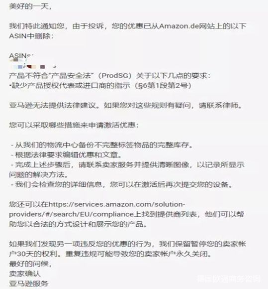 德国的海关会直接抽查那些没有遵守法规的产品,亚马逊平台接到客户投诉后就会通知卖家并下架产品,更有甚者直接暂停销售权限。