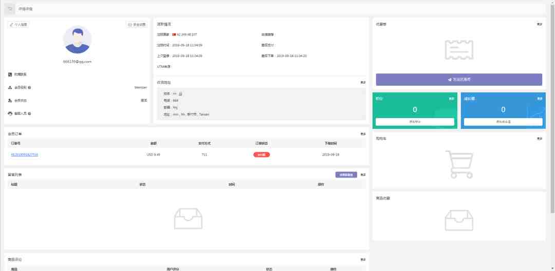 会员级别,留言列表,订阅列表,会员购物车,会员收藏,商品评论以及积分设置。
