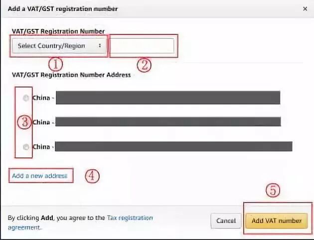 打开亚马逊英国站[url]www.amazon.co.uk,登陆亚马逊账号 看到右上角Settings(设置),鼠标移动到“Settings(设置)”上,在出来的下拉选项中,点击“Account Info(账户信息)” 在出来的界面中,看到下面“Tax Information (税务信息)”,点击“VAT/GST Registration Numbers (VAT/GST注册编号)” 弹出界面左上角,点击“Add a VAT/GST registration number (添加增值税/商品和服务税登记号)” 弹出的对话框“Add a VAT/GST registration number (添加增值税/商品和服务税登记号)” ①点击“Select Country/Region(选择国家/地区)”,这里选择对应的“United Kingdom(英国)” ②在“Select Country/Region(选择国家/地区)”右边的方框中,填写您对应的VAT税号(以英国为例:GB开头+9位数字那个编码) ③在“VAT/GST Registration Number Address (增值税/商品和服务税登记号所在地址)”,选择列举出来的一个你亚马逊对应账号的地址(跟申请VAT一致的地址),如果没有,就点击“Add a new address(添加新地址)”,手动输入新的对应地址 最后,检查无误,点击“Add VAT number(添加增值税号)”