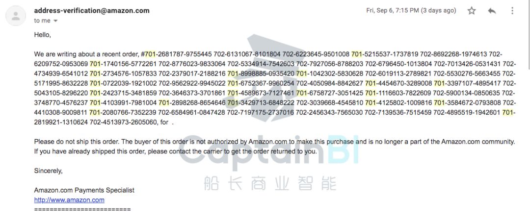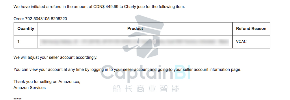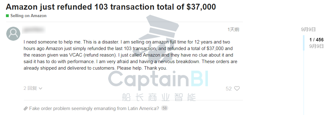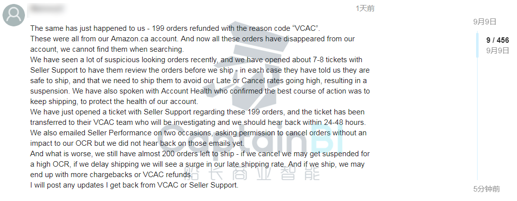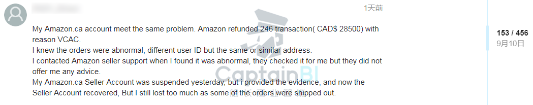 多位卖家上百个订单被自动退款 近日,船长BI注意到,有不少卖家出现订单被自动退款的情况。令人震惊的是,遇到此情况的基本上都是运营了很多年的老卖家,并且订单被退款数量多达上百个。目前,已经有多位卖家在亚马逊卖家论坛上反馈和求助此问题的解决办法。 卖家A 103个订单被退款,金额高达3.7万美金 (图源亚马逊卖家论坛) 该卖家称,自己做亚马逊已经有12个年头了,这次遇到了一个很大“灾难”。最近的103笔交易订单因“VCAC”(退款原因)被退款,总退款金额高达3.7万美金。 让人感到奇怪的是,那些被退款的订单,都无法正常搜索到,搜索结果显示"The was an error,please try again later.(出现错误,请稍后再试)"。 (图源亚马逊卖家论坛) 卖家还称,最初给亚马逊打了电话,但对方却回应不清楚该问题,并表示这可能和绩效有关。与此同时,卖家还收到了address-verification@amazon.com发送的邮件,邮件内容中列出了被退款的订单号,卖家也被告知不要给这些订单发货,因为这些订单的买家没有权限在亚马逊下单购买。如果已经发货,请联系物流商把货物退回。 (图源亚马逊卖家论坛——卖家收到的邮件) 对于亚马逊的这波操作,卖家表示很无奈。通常在过去,如果卖家收到这样的邮件,并且订单已发货,亚马逊应该使用自己的资金进行补偿。 卖家B 199个订单被退款,已经无法查找到它们 (图源亚马逊卖家论坛) 卖家B也遇到了同样的问题,因为 “VCAC”已有199个订单被退款。该卖家表示,这些订单已经从账户上消失了,无法找到它们。目前已经转给VCAC团队,他们正在进行调查,但目前还没有收到回复。 卖家C 被退款246个订单,金额高达2.85万加元 (图源亚马逊卖家论坛) 和上面的卖家一样,也是来自加拿大的卖家,同样由于VCAC原因,被退了246个订单,金额高达2.85万加元。 关于退款原因“VCAC”的猜测 正如上述卖家卖家遇到的情况,亚马逊出现自动退款,理由是“VCAC” ,但很少有卖家了解这到底是怎么回事,平台本身也没有给出具体的解释。 (图源亚马逊卖家论坛——卖家被退款的原因) 早在几年前有遇到类似问题的卖家表示,“VCAC”的全称为“Veteran Customer Account Compromise”,指的是老客户账户被泄露的意思。 还有知情人士透露称: “VCAC是一个欺诈调查部门,我在销售支持部门工作,我能给你的就这些了。” 亚马逊官方这样回应 截止发稿前,船长BI注意到,亚马逊官方论坛的版主“Susan”连发两条回复,给出如下回应: (图源亚马逊卖家论坛——官方版主的回复) 此外,还有卖家经过长时间的等待,收到了亚马逊卖家支持给出的如下回复: (图源亚马逊卖家论坛——卖家收到的邮件) 虽然亚马逊有对此做出相关的回应,但实际上并没有帮助卖家解决问题。船长BI认为,现在,亚马逊在处理此问题上应该不会那么快给到解决方案,卖家还是继续多尝试联系亚马逊并等待其给出应对的办法。 对退货退款问题,卖家需引起重视 在运营亚马逊过程中,退款问题时常都会发生。那么,卖家该如何去分析和改进,降低退款率呢? 通过船长BI「财务/VAT」中的「退款分析」功能,以退款时间为准,部分模块会结合退款订单的下单时间进行分析。你可以查看近一个月退款数据,包括退款的商品数、销售商品数、退货率、退款金额、退款费用等。 (点击查看大图) 不仅如此,你还可以查看订单或退款的地域分布占比情况,以及退款的原因,船长BI会根据系统统计的退款分析的数据给出相关的改进建议,仅供参考。 (点击查看大图) 总而言之,无论是平时常出现的退货退款,还是像这次亚马逊出现大量订单被自动退款的情况,卖家都需要重视。旺季在即,卖家千万要维护好自己的账号,不要因为一些不必要的失误给自身造成损失。