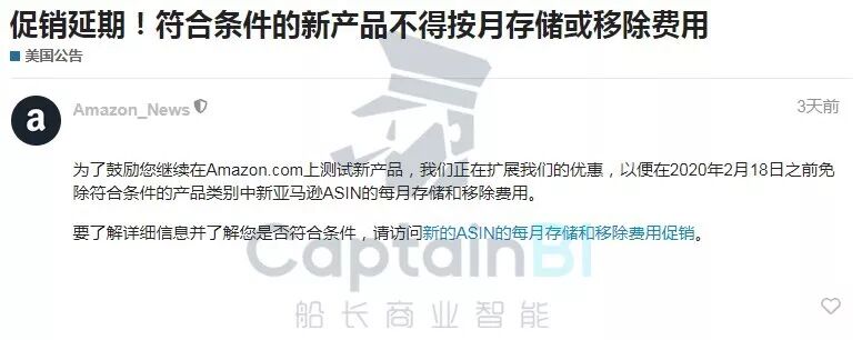 (图源亚马逊帮助页面) 不过,船长BI获悉,亚马逊美国站在上周发布公告表示,为了鼓励卖家继续在亚马逊平台上测试新商品,原本定于 9 月 30 日结束的免月度仓储费和移除费促销活动将延长至明年的 2 月 18 日。 (图源亚马逊卖家论坛) 也就是说,接下来,卖家将有更长时间享受这项的福利政策。还没了解卖家趁此机会可以做个详细了解,在一定程度上,能够大大降低自己的运营成本。 该活动面向哪些站点的卖家开放? 船长BI了解到,该活动面向美国站、欧洲站和日本站的卖家开放,但前提是卖家必须满足参与该活动的资格。 哪些卖家可以获得参与该活动的资格? (1)美国站:必须是使用 FBA 的专业销售计划的卖家,并且库存的绩效指标(IPI)需达到 350分 或以上 ,或尚未获得 IPI 分数的专业销售计划的新卖家。 (2)欧洲站和日本站:只要符合专业销售计划的卖家身份即可参与。 参与该活动准入商品的门槛要求有哪些? 船长BI获悉,卖家参与该活动的商品必须符合以下条件: (1)必须是小号标准尺寸和大号标准尺寸的商品; (2)必须是 3 月 18 日之后,及活动开始后创建的新 ASIN。 注意:创建的 ASIN 必须都是新品,且注意在欧洲站,ASIN 必须在欧洲五个站点中都为新品。 哪些分类的商品有资格参与该活动? 据亚马逊官方推送的消息显示,符合要求的商品分类如下: (图源亚马逊全球开店) 如上图所示,适用的商品类目,具体包括: 服装、电器、艺术品、工艺品和缝纫用品、汽车用品、母婴、美容化妆、摄影摄像、手机和配件、收藏品、电脑和视频游戏、电脑、电视/音响、礼品卡、杂货、个护健康、家居和园艺、工业与科学用品、珠宝首饰、乐器、设备和配件、办公用品、庭院、草坪和花园、宠物用品、鞋靴、运动户外、工具和家居装修、玩具和游戏、钟表和酒类。 注意:媒介类商品分类中的 ASIN 和二手商品没有资格参与促销。 如何报名参与该活动? 卖家需完成以下 3 个步骤即可成功参与该活动: 注册 创建ASIN 入库 注意:ASIN 如果有父子变体,父 ASIN 必须是在活动开始之后创建,费用优惠也是基于父 ASIN 进行计算。因此,船长BI建议卖家考虑变体比较少的产品,相对会比较有利,这样对于每个变体能分到的免费名额也多一些。 该活动具体的促销方式是如何运作的? (1)免除月度仓储费 美国站:在 2020 年 2 月 18 日之前,亚马逊将免除每个符合条件 ASIN 的前 50 件商品的月度仓储费。 欧洲站和日本站:在 2019 年 9 月 30 日之前,亚马逊将免除每个符合条件 ASIN 的前 50 件和前 30 件商品的月度仓储费。 (2)免移除费 自 2019 年 7 月 1 日起至活动结束,卖家可以申请从这些商品中移除任意数量,而无需支付亚马逊物流移除费用。 其实,船长BI认为,从这次亚马逊延长活动时间,我们也不难看出亚马逊给卖家提供优惠的只是间接目的,主要目的还是为了平台新品的增长量,以更多的新品来满足不同消费者的需求。对于卖家,可以通过该活动来减少测款的成本,但新品的选择和打造就依旧很重要,如果新品销售起不来同样还是会造成货值的折损的。 (点击查看大图) 卖家们可以借助工具优势,把控好选品工作。通过船长BI的「大数据选品」搜索相关产品的关键词,你可以查看自己所做站点以及相关品类下的商品数据情况。例如:品牌、卖家数、搜索排名、类目排名、月销量预估、reviews数量等,利用这些数据,你可以更好地进行选品调研。 最后,建议卖家把参与亚马逊促销活动省下来的仓储费用于接下来的旺季引流,对于提升销量也是有帮助的。