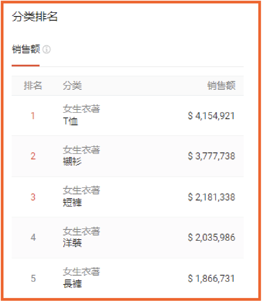 基于我们所选的订单类型和时间段,分类排名会展示店铺总销售额排名前五的子类目及销售额。