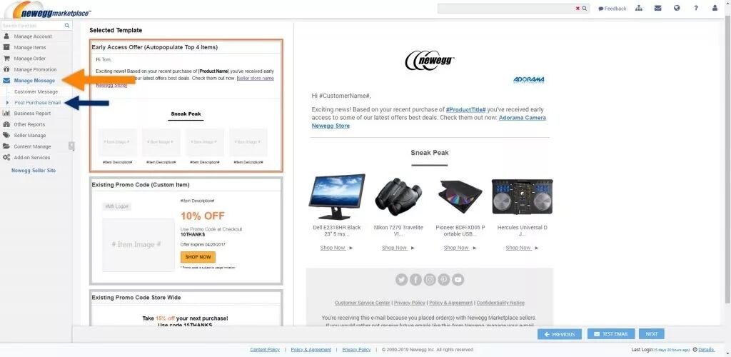 对于电商卖家来说,培养客户忠诚度是决定店铺能否获取持续稳定订单的关键,谁都不愿只依靠不停地花钱促销来吸引流量。换句话说,只有拥有忠诚的消费者复购,才可能依靠自然流量来获得订单。蛋蛋酱今天就要为大家介绍一种最有效的培养客户忠诚度、提升复购率的方法——售后邮件。 售后邮件是什么 简单来说,售后邮件就是卖家向曾经购买过自己商品的消费者发送的店铺新动态、新产品及新促销活动的电子邮件。因为有了过去购买的良好体验,因此消费者在收到这些邮件后,很容易就会使他们产生再次消费的念头,而且这些消费者都是卖家最真实最直接的目标客户群,因此售后电邮对于培养客户忠诚度,提升消费者的复购率是非常有帮助的。 如何创建售后邮件 售后邮件的创建非常简单,只要六个步骤就可以轻松搞定。 Step https://img.maifangtong.com1/viewthumb:登入您的Seller Portal卖家账户 Step 2:在左侧导航栏点击“Manage Message”,如果您是参与了精英卖家项目(Elite Seller Program)的企业级卖家(Enterprise Seller),就会看到“Post Purchase Email”选项。(关于精英卖家项目的相关详情,可以点击这里查看) Step 3:选择您希望使用的邮件模板 Step 4:进行邮件测试 Step 5:选择您想要发送邮件的客户对象 Step 6:预定邮件发送的时间或选择直接发送 售后邮件模板的选择 为了方便大家使用售后邮件功能,Newegg国际商城Seller Portal系统为大家贴心的准备了多个模板,可以让大家根据不同的使用场景来选择使用。 #https://img.maifangtong.com1/viewthumb - Top 4热门产品自动推荐模板(Early Access Offer/Auto-Populate Top 4 Items) 这个模板可以自动选择卖家四个最热门的产品向客户进行推荐,而且在这个模板中可以选择不显示促销价格,帮助卖家摆脱只会打价格战的形象,成功塑造自己店铺的品牌形象。 #2 - 客户定制商品促销模板(Existing Promo Code/Custom Item) 当有客户购买了一款商品后,卖家可以利用这个模板来向客户推荐与已购买商品相关的配件商品或商品促销码,从而激发卖家的后续购买行为。比如针对购买单反相机的客户,发送推荐镜头产品的邮件;或是像下图这样:向购买了SSD硬盘的卖家推荐SSD硬盘盒产品。需要注意的是,由于这一类的售后邮件是定制化的,因此应该有针对性的发送,发送范围也比第一种模板小许多。 #3 - 促销折扣码推荐模板(Existing Promo Code/Store-Wide) 这个模板的作用与前一个类似,也是激发消费者进行复购,不同之处在于,这个模板的接收对象更为广泛,无需为特定产品的购买者准备,而是适用于所有在店铺内消费的客户。 #4 – 主打产品推荐模板 (Popular Products/Custom Multi-Item) 这个模板对于卖家使用的自由度相对比较高,卖家可以选择任意的、不同类别的商品放入售后邮件,从而向客户进行展示。下图就是卖家利用售后邮件向消费者展示键盘产品的例子。 虽然售后邮件的效用很强大,但需要注意的是,有句话叫“过犹不及”,如果不停地向顾客发送此类邮件,也会引发顾客的反感,因此建议卖家每个月只发送https://img.maifangtong.com1/viewthumb次售后邮件。而在针对不同消费者的售后邮件中,商品的选择也至关重要,应该做到有的放矢的定制化,否则花费了大量精力发送的这些邮件,最后也很难取得理想的效果。此外,蛋蛋酱也建议大家,在客户购买完商品后,发出感谢购买的邮件,并提醒客户为商品在网站上做出公正准确的售后评价。 好了,看到这里,大家是不是都跃跃欲试,希望能够利用售后邮件功能拉近与消费者之间的距离、获取回头客了吧。那就赶紧开始尝试吧。哦,对了,如果对于售后邮件设定的具体步骤还有疑问的话,可以点击这里查看详情,当然也可以给蛋蛋酱留言哦!