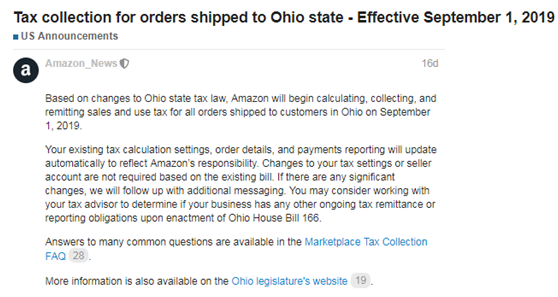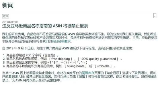 一 欧洲站卖家需要对Business买家的订单上传发票 在8月末,有欧洲站卖家反映,在其后台的订单状态下出现了“缺少发票”的提示字样(如下图所示)。 (图源卖家后台订单管理) 据船长BI了解,这是亚马逊对卖家后台管理订单新增的功能,主要是针对 Business买家的订单(即B2B订单),需要上传发票,并非强制所有卖家都要上传;而对于普通订单,除非有买家索要或法律要求,卖家才需要提供发票。 如何解决“缺少发票”的问题? 目前,提供发票有三种方式: 1、通过后台管理订单或者订单详情页面上传; 2、使用VCS(增值税计算服务),亚马逊将自动准备电子版增值税发票,以便买家随时自助下载; 3、通过电子邮件将 PDF 格式的发票发送到订单报告中提供的买家电子邮件地址;关于税务发票的更多专业性问题,卖家应该咨询他们的税务顾问。 PS:对于自发货卖家,需要向买家提供订单收据的,同样需要特别注意。 具体操作请点击→满屏飘红!亚马逊欧洲站卖家后台突现缺少发票提示,可以这样解决 二 8月30日起,所有鞋类ASIN实行尺码新标准 今年5月份,很多卖家都有收到亚马逊的邮件通知:亚马逊将把平台上的listing中使用的通用尺码替换为品牌的尺码表。品牌的特定尺寸图表为客户提供详细的测量信息,以确保产品适合。 此外,船长BI还获悉,该新规适用于亚马逊美国站,已品牌备案的卖家,并且已从2019年8月30日起开始执行。现在所有鞋类ASIN实行尺码上都要遵循新的标准,包括了鞋类尺寸、宽度、性别和年龄组相关的信息。8月30日之后,亚马逊可能会删除不符合新标准的ASIN。 如何解决鞋类ASIN尺码问题? 卖家必须将宽度和大小单位必须分成两个不同的属性,亚马逊只接受美国市场上任何鞋子的美国尺码。 1、要使用亚马逊的鞋尺标准阅读新页面,请单击此处(需要登录卖家中心)。 2、要阅读亚马逊的鞋尺标准常见问题解答,请单击此处(需要登录卖家中心)。 3、要下载亚马逊的有效尺寸Excel电子表格,请点击此处。 PS:亚马逊保留关于尺寸在ASIN上的显示方式的最终决定权。因此,如果你和其他卖家都列出了相同尺码的鞋子,亚马逊的鞋码标准化逻辑可能会将这两种尺码转换为一个通用值以防止混淆。 三 9月1日起, FBA Donations(捐赠)计划生效 上个月,有不少卖家收到了一封邮件,亚马逊将推出一项名为Fulfillment by Amazon Donations(亚马逊FBA捐赠)的新计划,希望其第三方卖家能更好地利用那些经常被丢弃的未售出或不需要的产品——把它们捐给慈善机构。 (图源亚马逊卖家论坛) 邮件内容指出,自2019年9月1日起,当卖家选择处理存储在美国亚马逊仓库的积压和退货库存时,亚马逊将自动向美国慈善机构提供符合条件的库存(包括退回的物品和多余的不需要的物品)。 与此同时,船长BI了解到,目前该计划面向在美国和英国的亚马逊仓库中储存库存的第三方卖家。 关于FBA捐赠计划,卖家需注意哪些问题? 1、如何参与FBA捐赠计划; 2、如何查看FBA捐赠计划状态; 3、如何退出FBA捐赠计划; 4、FBA捐赠计划是否收费。 PS:除了FBA捐赠计划外,还有一些常用的清库存方法也是可以帮助卖家处理积压库存的。 四 9月1日起,运往俄亥俄州的订单将征收销售税 船长BI获悉,近日,亚马逊宣布根据俄亥俄州税法的变化,将于2019年9月1日开始计算、收取、汇出所有运往俄亥俄州客户的订单的销售税和使用税。 (图源亚马逊卖家论坛) 卖家现有的税务计算设置、订单细节和付款报告将自动更新,以反映亚马逊的责任。不需要根据现有账单更改你的税务设置或卖家帐户。如果有任何重大更改,亚马逊将使用附加消息进行跟踪。 在俄亥俄州众议院第166号法案通过后,卖家可以考虑与自己的税务顾问合作,确定自己的企业是否有任何其他正在进行的税务汇款或报告义务。 五 9月3日起,物流移除和弃置费用变更 自2019年9月3日起,亚马逊将会定期审查FBA移除和弃置费用,欧洲的某些FBA移除和弃置费用将进行调整: (图源亚马逊新闻) 国内移除费用:降低英国运营中心的标准尺寸商品和大尺寸商品的移除费用;提高西班牙运营中心的大件商品的移除费用。 跨境移除费用:降低存储在英国、德国、法国、意大利、西班牙、波兰和捷克共和国的商品的跨境移除费用。 弃置费用:将提高存储在英国、德国、法国、意大利、西班牙,波兰和捷克共和国的商品的弃置费用。即将推出的费用基于商品的重量和尺寸。 六 9月6日起,亚马逊产品名称实行新要求 据亚马逊8月发布的消息,自2019年9月6日起,违反亚马逊产品名称政策的ASIN将被禁止搜索。 (图源亚马逊新闻) 卖家的产品名称不允许出现以下情况: 1、产品名称超过200个字符(含空格)。 2、产品名称包含促销短语,例如[free shipping], [100% quality guaranteed]。 3、产品名称包含装饰字符,例如~!*$ ?_~ {} # <> * ; ^。 4、产品名称不包含能识别商品的信息,例如[hiking boots]或[umbrella]。 若产品名称出现上述情况被禁止搜索,如何解决? 1、先查看在管理库存页面的“禁止显示”选项卡是否有收到通知; 2、根据提示,点击“编辑”按钮修改产品标题,直到不再出现提示,保存后等待亚马逊处理,通常在24小时内会恢复。 其实,这项新规和亚马逊7月22日开始执行的产品标题新政如出一辙。 具体详情请点击→亚马逊政策变更,不符合要求的产品标题将从搜索中删除 除了要注意以上几个重要的新规,还要注意的是,亚马逊黑五和