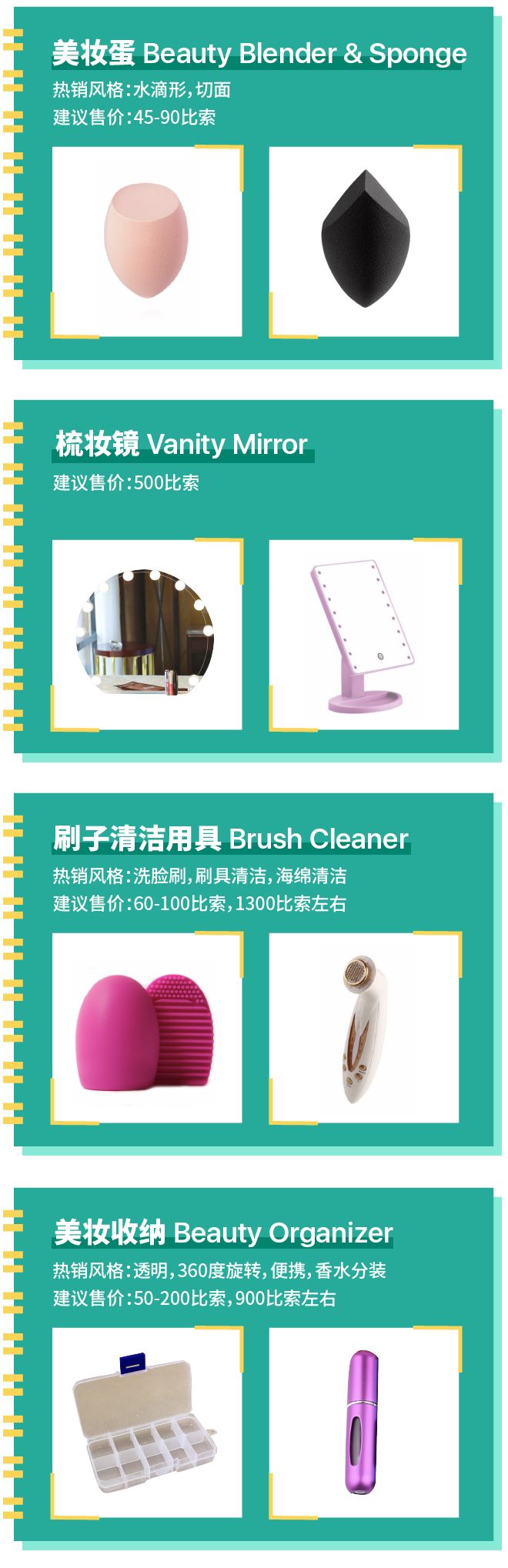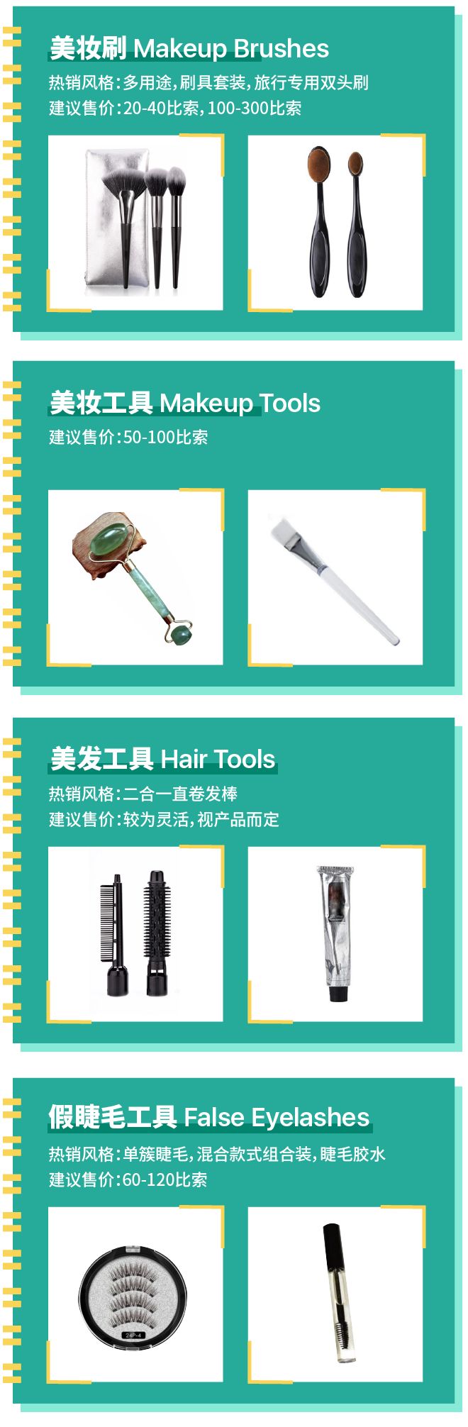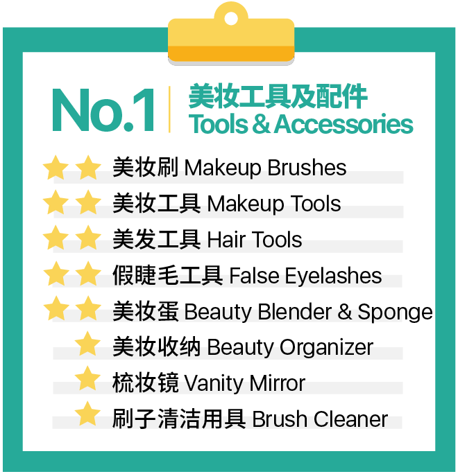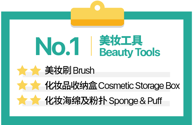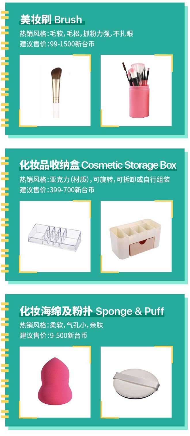 在美妆工具中,消费者最喜爱的类目是美妆刷、收纳盒和海绵粉扑用具,价格区间在100-1500新台币,卖家可从这些子类目中进行选品。