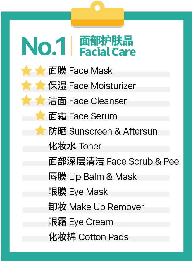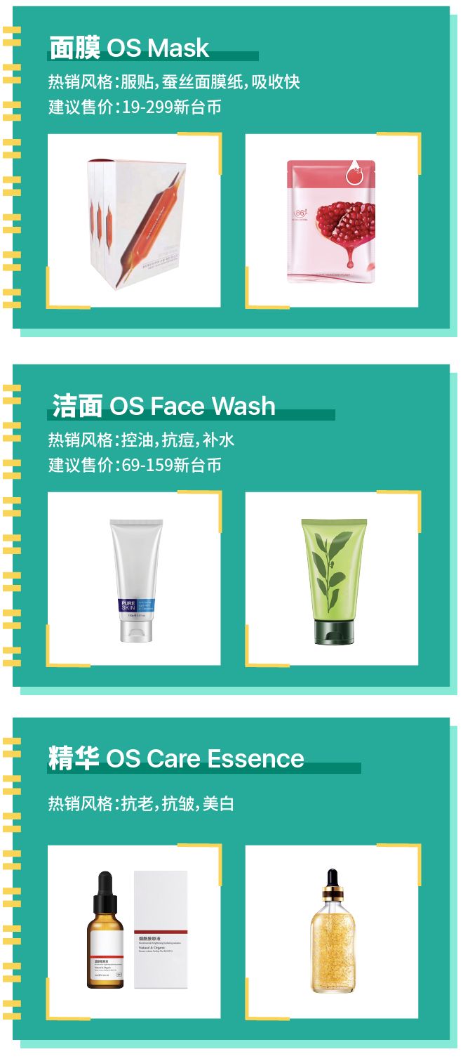 面膜、洗面奶和精华是台湾护肤品中最热门的三种商品。消费者对护肤品的功能性比较看重。