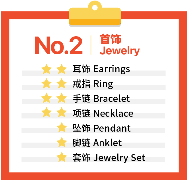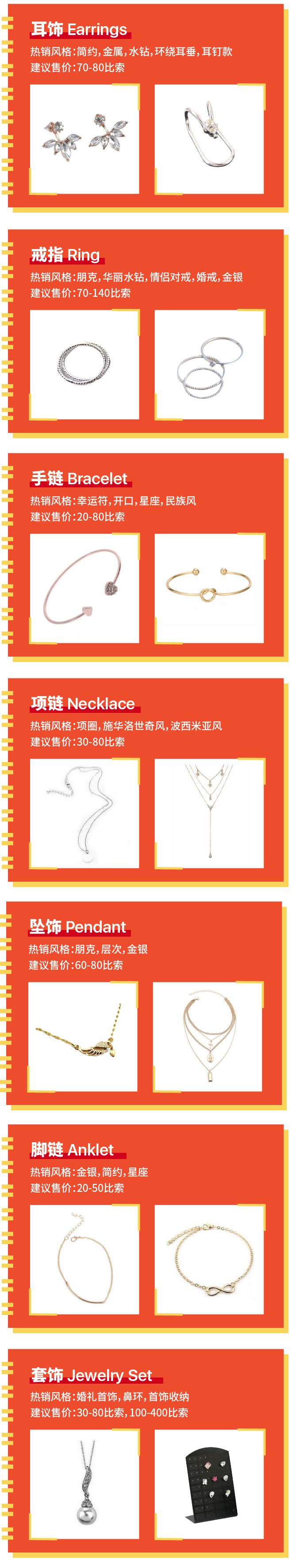 耳饰、戒指、手链、项链等类目都十分热销,买家喜爱水钻、金银、星座等元素,卖家可以往施华洛世奇风、波西米亚风、朋克风等多种风格上进行选品。图片有产品实物、模特图、多选项更能吸引买家注意,容易出单。