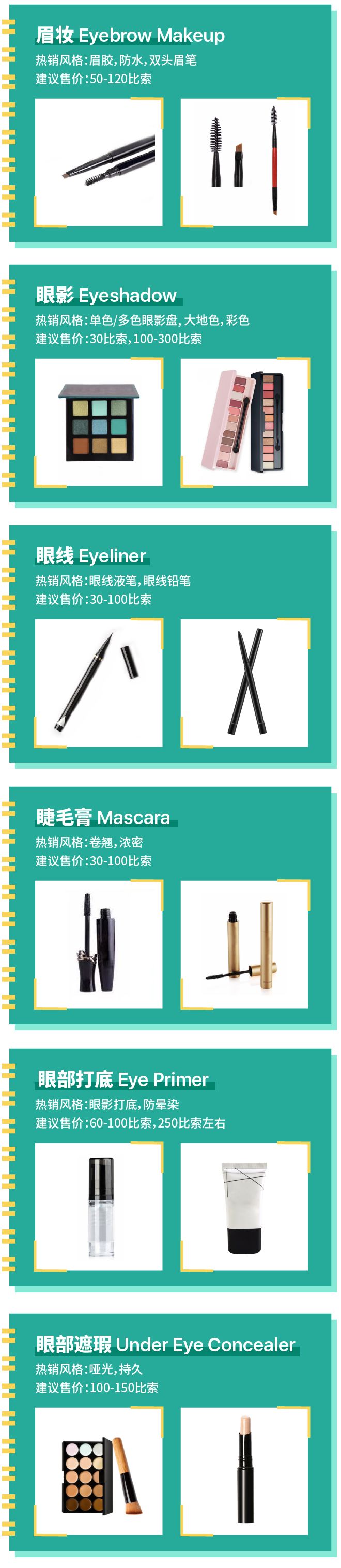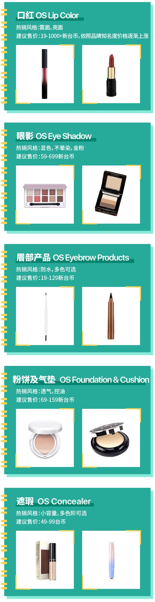 化妆品中,口红、眼影、眉妆产品、粉饼、遮瑕等较为热卖。台湾买家注重产品的性价比,卖家要多加注意设置合理的产品价格。