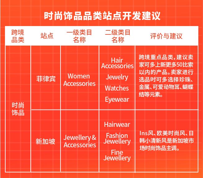 女性配饰(Women Accessories)在菲律宾市场是Q3重点类目,发饰、首饰、手表、眼镜是女性配饰的重点二级类目,二级类目下还有更加详细的产品推荐,快来看看店铺建议和选品建议吧~