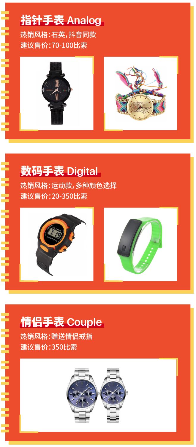 菲律宾买家十分看重产品的性价比,100比索以内的手表卖得很好。石英手表、运动款手表、带有卡通形象的经典款手表都是热销产品,抖音同款表也是热卖款之一。