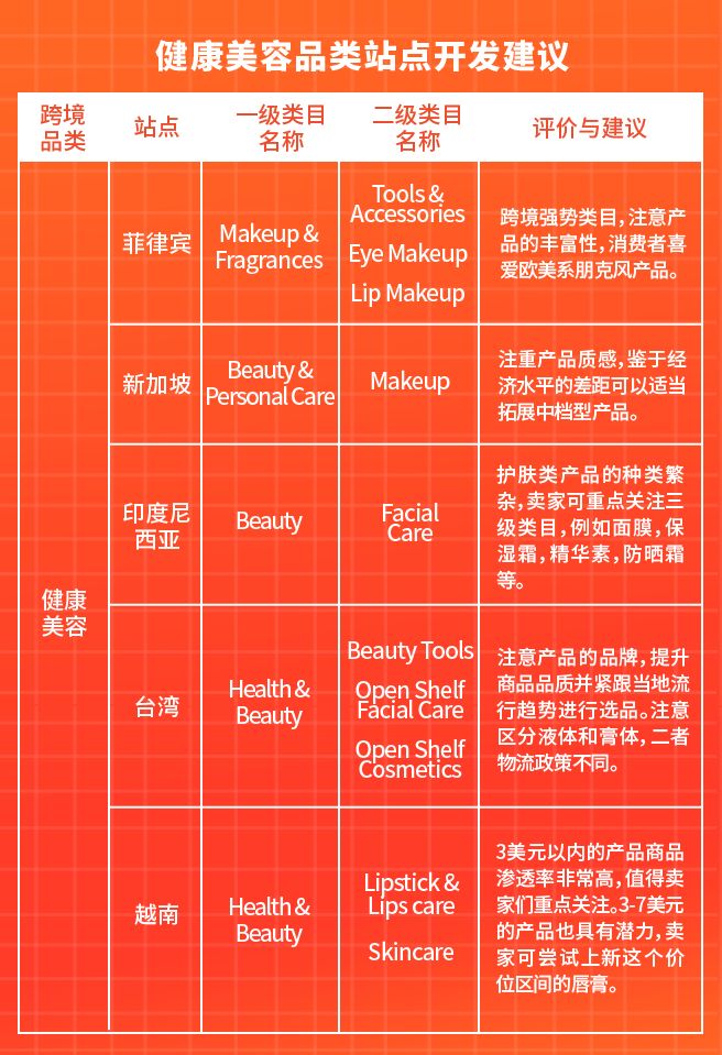 健康美容品类是跨境强势类目,也是Q3的重点类目。美妆工具是竞争十分激烈的一个子类目,主要表现在产品种类的丰富性上。除了上妆的工具,各类护肤类工具以及身体护理类产品都是每个站点强烈推荐的产品。至于流行更迭速度较快的彩妆类产品,卖家可以注意根据流行趋势来进行差异化推广。