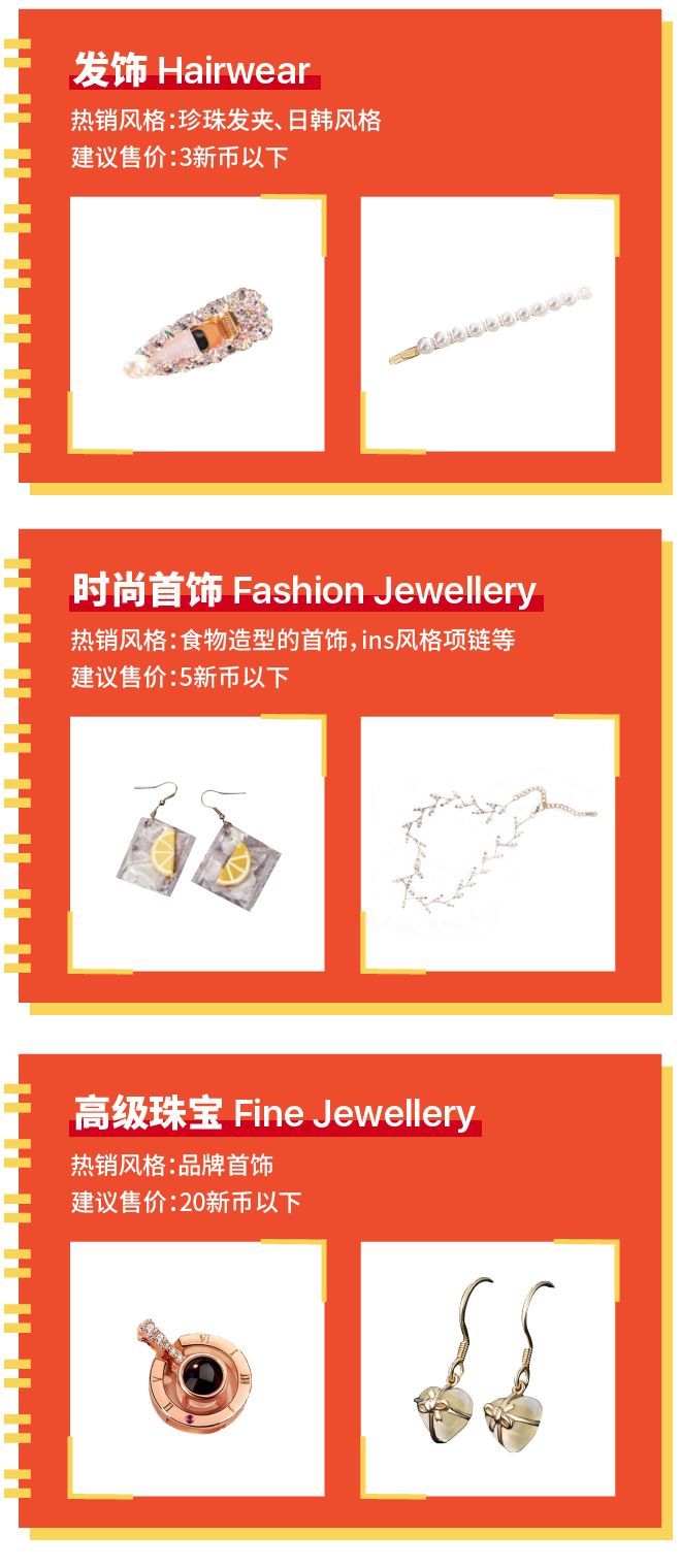 珠宝配饰(Jewellery & Accessories)在新加坡站点是重点品类,发饰、时尚首饰、高级珠宝都是十分热卖的重点子类目,ins风、欧美时尚风、日韩小清新甜美风都是热门风格,卖家可考虑在这些类目及风格进行选品。