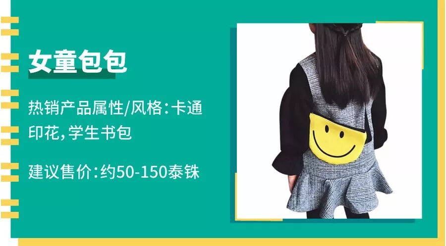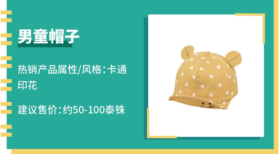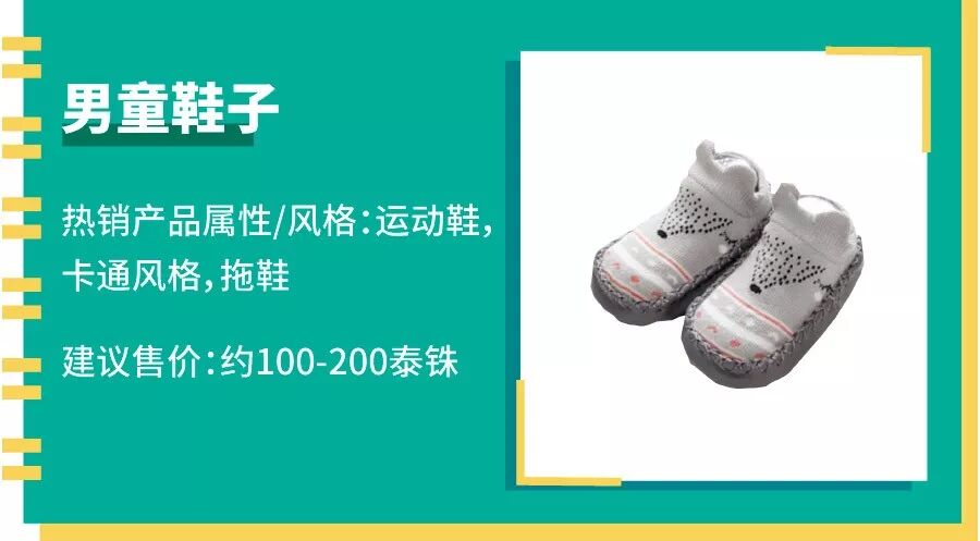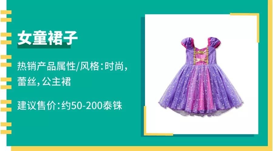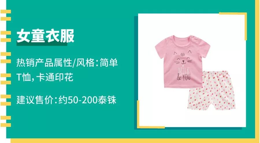 在泰国,男童及女童时尚受到买家关注,小码T恤,带有卡通印花的服饰都是销量极佳的产品,卖家可以多开发上新此类产品。卖家在选品时需要注意季节性潮流趋势。