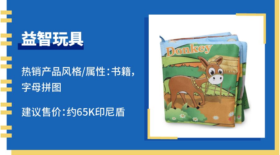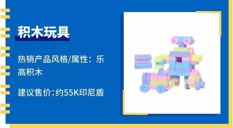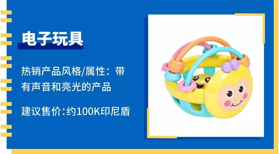 益智玩具、户外玩具在印尼站点非常受欢迎,跨境卖家价格方面比本地卖家有优势,建议卖家开发更多玩具产品,引领玩具新潮流。