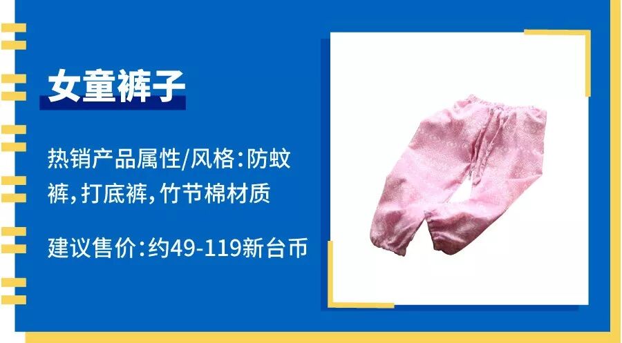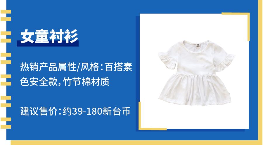 5美元以下的女童服饰类产品卖得最好,竹节棉材质在台湾买家中受到欢迎,卖家在上新时可以选择比较日常的女童服饰款式。