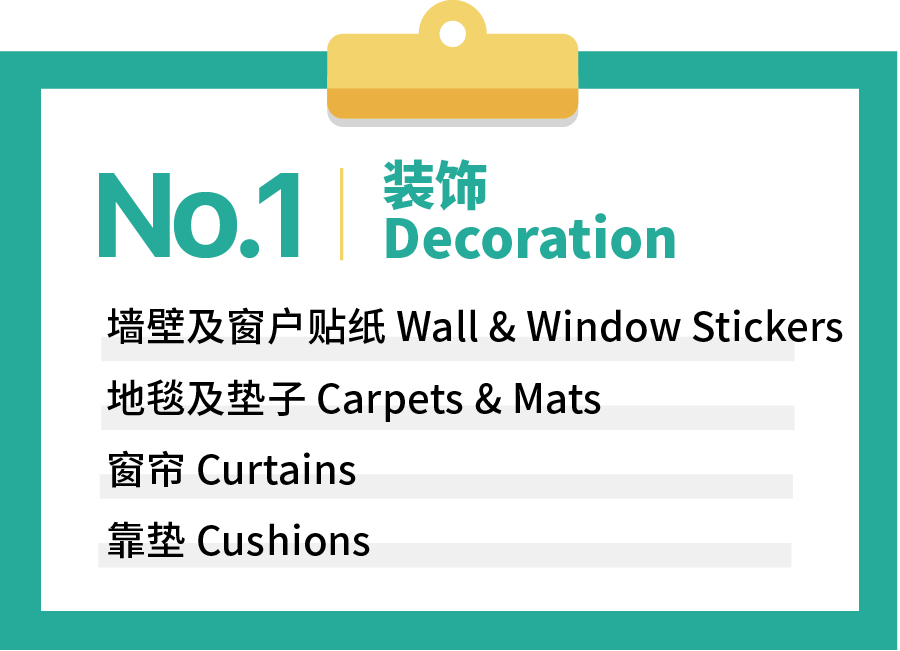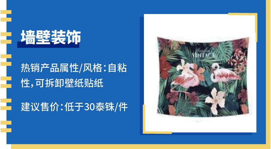 家居装饰产品中,自粘性产品和可拆卸壁纸贴纸受到泰国买家的喜爱,低于5美元的产品竞争力较高。