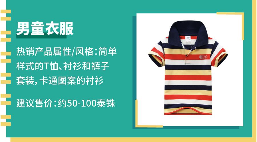 简单休闲及带有卡通印花的男童服饰在泰国比较流行,产品价格大多集中在50-200泰铢。