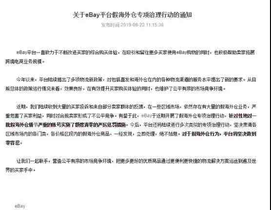今年7月份,eBay针对虚拟海外仓现象发布了关于维护平台公平健康发展的政策说明。