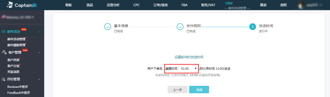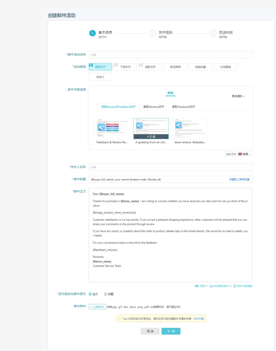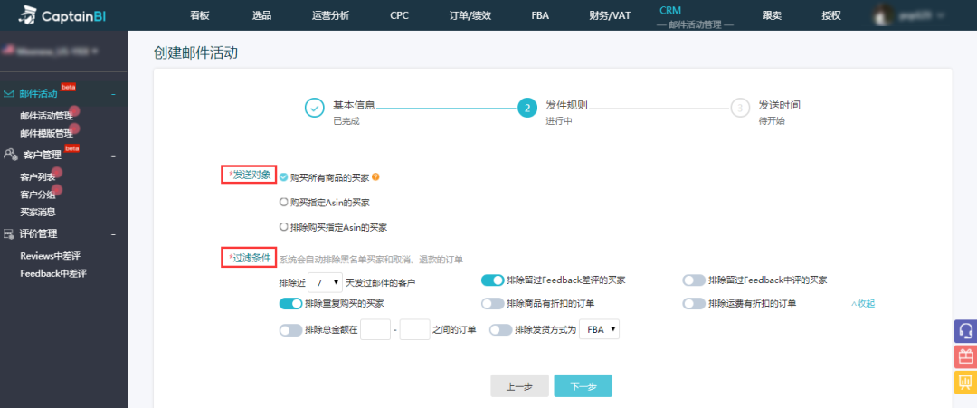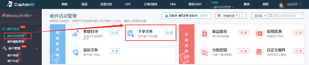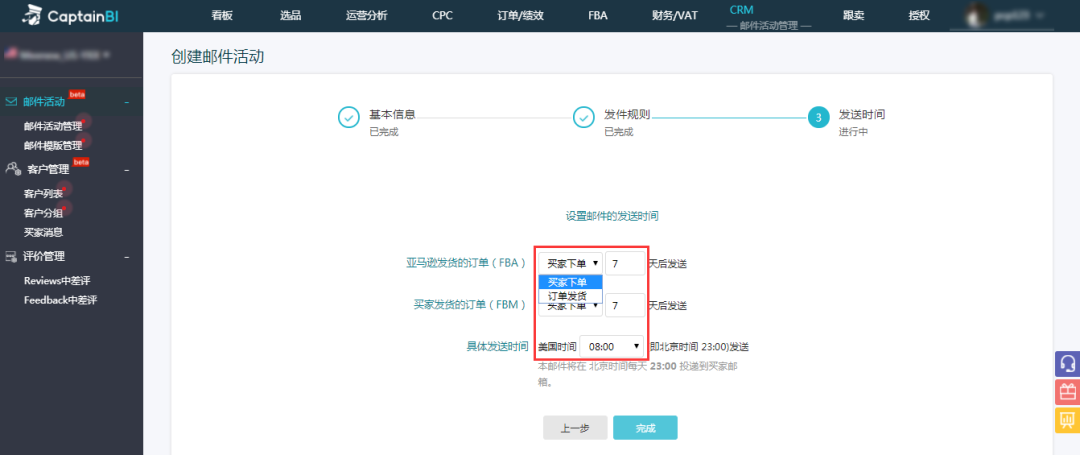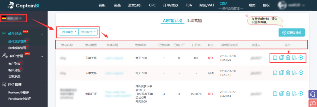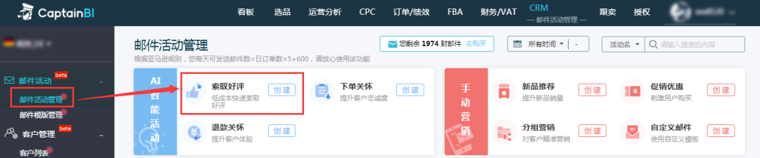 卖家催评催来亚马逊警告信 然而,并不是所有卖家都能够利用好邮件索评,船长BI时常会看到一些卖家因为不当的索评操作,好评没来,却招来差评,甚至收到亚马逊的警告信。 (图源卖家社区) 像上述卖家出现的案例还有很多,出现这种情况的原因,一方面就像卖家所说的催评催得太急;另一方面就是邮件索评过程中可能还存在其他不合适的操作。 邮件索评前需注意的事项 注意索评的对象 排除之前给你留过差评的客户、近期已经有发送过索评邮件的、留过feedback的客户,以及有折扣、取消或退款的订单。这些都不合适进行索评。 注意索评邮件的主题/标题 结合不同的场合设置不同的主题,比如感谢购买、提供售后服务等,提高索取好评的成功率。 注意索评邮件的内容/模板 一定要站在客户的角度去考虑,邮件内容以询问客户体验为主,切勿长篇大论,切勿出现直接向客户索要好评的文字以及留评的奖励等信息,减小被亚马逊审查和客户拒收邮件的风险。另外。你还可以给客户一个专业的形象,让对方感到重视,若客户有什么不满意的地方可以先和你联系,有必要可以将客户的姓名与订单内容包含在邮件中。 注意索评邮件的发送时间 不同站点对应国家的时差,像北美、欧洲地区就需要特别注意。船长BI建议在订单发货后的10至15天,客户收到货后的3-5天左右再发索评邮件会合适些,如果客户已经使用了你的产品,他才会有兴趣看你的索评邮件。 有经验的卖家反馈表示,在当地时间早上10点左右发回复率最高。 注意索评邮件的发送频率 控制索评邮件的发送频率非常重要,同一个客户不要频繁的向其索评,引起反感的话,会适得其反。 那么,卖家如何在遵循亚马逊review政策的前提下,进行合规邮件索评呢? 索评正确操作方式分三步走 确认购买→下单关怀 在船长BI「CRM-邮件活动管理」中,选择「AI智能活动」,创建「下单关怀」邮件活动。 (点击查看大图) 在创建「下单关怀」邮件活动页面,你可以根据页面操作提示,填写邮件活动名称、发件人名称、邮件标题,并选择模板语言和你想用的邮件模板风格,对于邮件内容,你也可以结合自己的产品信息进行再优化。 (点击查看大图) 创建好后,可以对该邮件进行预览、或者发送测试邮件以及保存为新模板等操作。进入下一步设置发送对象和过滤条件。 (点击查看大图) 上述步骤操作完成后,进入最后一步,设置邮件的发送时间,即邮件的发送规则。 (点击查看大图) Tips: 确认发货→订单跟进 订单跟进可以参照上述第一步创建「下单关怀」邮件活动,主要的区别在于邮件主题、内容和发送时间。 Tips: 确认收货→邮件索评 在船长BI「CRM-邮件活动管理」中,选择「AI智能活动」,创建「索取好评」邮件活动。 (点击查看大图) 在创建「索取好评」邮件活动页面,操作步骤和第一步一样,主要是邮件活动名称、发件人名称、邮件标题,并在选择模板语言和你想用的邮件内容模板的风格上要注意区分。 (点击查看大图) 设置发送对象和过滤条件也参照「下单关怀」的这一步操作,最后一步设置发送时间上,你可以通过更精准的筛选条件,比如选择亚马逊发货的FBA订单,客户下单或订单发货多少天后,以及具体的发货时间进行发送。 (点击查看大图) Tips: 与此同时,你也可以根据授权的店铺切换查看对应站点已创建的邮件活动。例如,通过「活动类型」或者「活动状态」下的相关条件查看目前正在执行和已经暂停的邮件任务。包括索评邮件发送的时间、已发邮件数、已被打开邮件数、索评邮件的打开率及任务状态等。 并且,你还可以对列表中的邮件任务执行编辑、复制、启动或暂停、删除和查看发送统计等操作。根据统计数据,进行适当的调整,以获取最佳的索评执行方案。 (点击查看大图) 除此之外,船长BI这次对CRM系统进行了全新改版,让卖家享受更好地操作体验并能更轻松地管理客户列表。 CRM系统全新改版,更加美观易用 三步完成邮件创建,低成本高效邮件营销 CRM全新上线「专业的过滤条件」。更加专业丰富的过滤条件,包括订单小金额和高折扣过滤。 (点击查看大图) 焕然一新的界面和邮件模板,体验飙升 CRM全新上线「精美邮件模板」。精美模板助你提升邮件索评和营销转化率,全方位帮助你的品牌和生意。不仅如此,你也可以自定义创建自己的专属邮件模板。 值得一提的是,船长BI目前提供六国语言(英语、西班牙语、德语、法语、意大利语、日语)的模板,你可以根据你所在的站点对应国家的语言进行自由切换选择。此外,客户在收到邮件后,可以根据邮件模板内容中的如「Write Review」等指引链接进行留评等相关操作。 (点击查看大图) 客户列表布局交互优化,使用更轻松 CRM全新上线「固定分组」功能。在船长BI「手动营销」模块中,你可以创建新品推广、促销优惠邮件营销任务,任意客户都可以手动被添加到固定分组,分组营销将更加精准且游刃有余。 (点击查看大图)