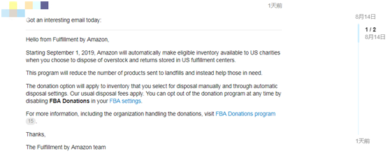 这段时间,有不少卖家收到了一封邮件,亚马逊将推出一项名为Fulfillment by Amazon Donations(亚马逊FBA捐赠)的新计划,希望其第三方卖家能更好地利用那些经常被丢弃的未售出或不需要的产品——把它们捐给慈善机构。 邮件详情如下: (图源亚马逊卖家论坛) 邮件内容指出,自2019年9月1日起,当卖家选择处理存储在美国亚马逊仓库的积压和退货库存时,亚马逊将自动向美国慈善机构提供符合条件的库存(包括退回的物品和多余的不需要的物品)。 也就是说,卖家参与亚马逊物流捐赠计划后,可以自动将不想要的库存捐赠给选定的美国慈善机构。并且,亚马逊还能够代卖家安排运输,不会收取其他额外费用。 同时,船长BI也获悉,亚马逊在后台和卖家论坛上也推送了关于FBA捐赠计划的消息。对于该计划,很多卖家表示并不希望亚马逊为自己做出决定。 (图源亚马逊卖家论坛) FBA捐赠计划适用对象 船长BI了解到,目前该计划面向在美国和英国的亚马逊仓库中储存库存的第三方卖家。当捐赠计划选择处理存储在这两个国家/地区的亚马逊仓库中的未售出或不需要的产品时,捐赠计划将成为所有卖家的默认选项。 此外,该计划将通过名为Good360的团体和Newlife和Barnardo等英国慈善机构分发给美国非营利组织网络。 亚马逊推出FBA捐赠计划的目的 该计划旨在减少送往垃圾填埋场的产品数量,帮助保护环境,并将原本被浪费掉的产品加以利用,捐赠给那些有需要的人。捐赠选项将应用于卖家选择手动或通过自动处理设置进行处理的库存。 还有一个原因是,亚马逊之前曾被调查曝光丢弃了大量未售出和不需要的库存。而亚马逊在美国的销售额占其总销售额的大部分,因此,其在美国仓库的销毁的库存数量远比其他国家来得多。 此外,船长BI还获悉,卖家销毁库存的原因有很多,包括退货或安全问题。在推出FBA捐赠计划之前,简单地销毁未售出的产品对于第三方卖家来说是更便宜的选择,每件产品仅需15美分,而退货则为50美分。而FBA捐赠计划推出后,将降低卖家捐赠多余库存的成本。亚马逊将未售出的库存返还给卖家的费用为50美分,远高于处理库存时收取的15美分。 关于FBA捐赠计划,卖家需注意以下几点: 库存积压是很多做亚马逊的卖家都会遇到的一个问题,一般过季或者销量很差的产品,如果控制库存不力,就容易导致库存过剩。不少卖家在处理库存问题上都很难找到好的解决办法。 除了新的FBA捐赠计划外,还有一些比较常用清库存的方法。 以下几个清库存方式仅供参考: 这段时间,亚马逊新计划不断。还是那句话,船长BI建议,卖家可以先衡量一下自己产品的库存价值和评估后续的销量,再决定是否有必要使用亚马逊新推出的FBA捐赠计划。
