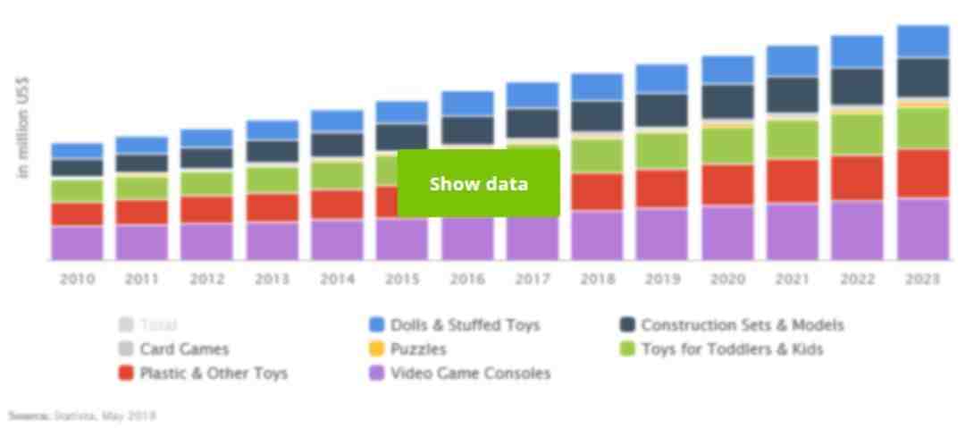根据Statista 2019年6月的报告显示,预计2019年,全球玩具和游戏市场的收入将达到2966.7亿美元。2019年至2023年,市场预计将以每年增长4.7%的增速继续保持高增长趋势¹。
