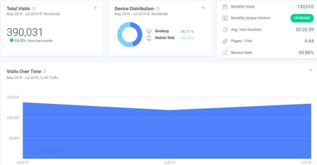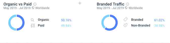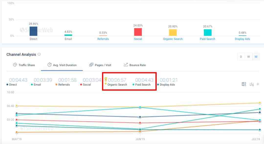 由上图,研究员观察到流量来源主要分成3个部分,分别是:直接浏览、通过搜索引擎浏览、社交媒体。其中,通过搜索引擎浏览的流量中中,自然流量占52.87%,付费流量占47.13%。