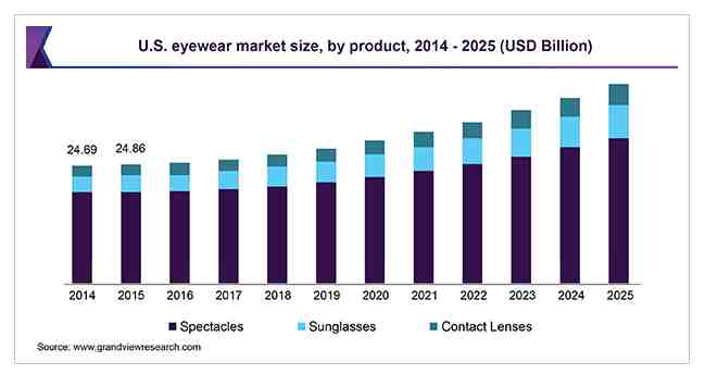 根据Grand View Research,2018年全球眼镜市场价值1313.2亿美元,预计2019年至2025年的复合年增长率将超过7.0%。预计视力缺陷的数量和眼科检查意识的提高将推动增长。
