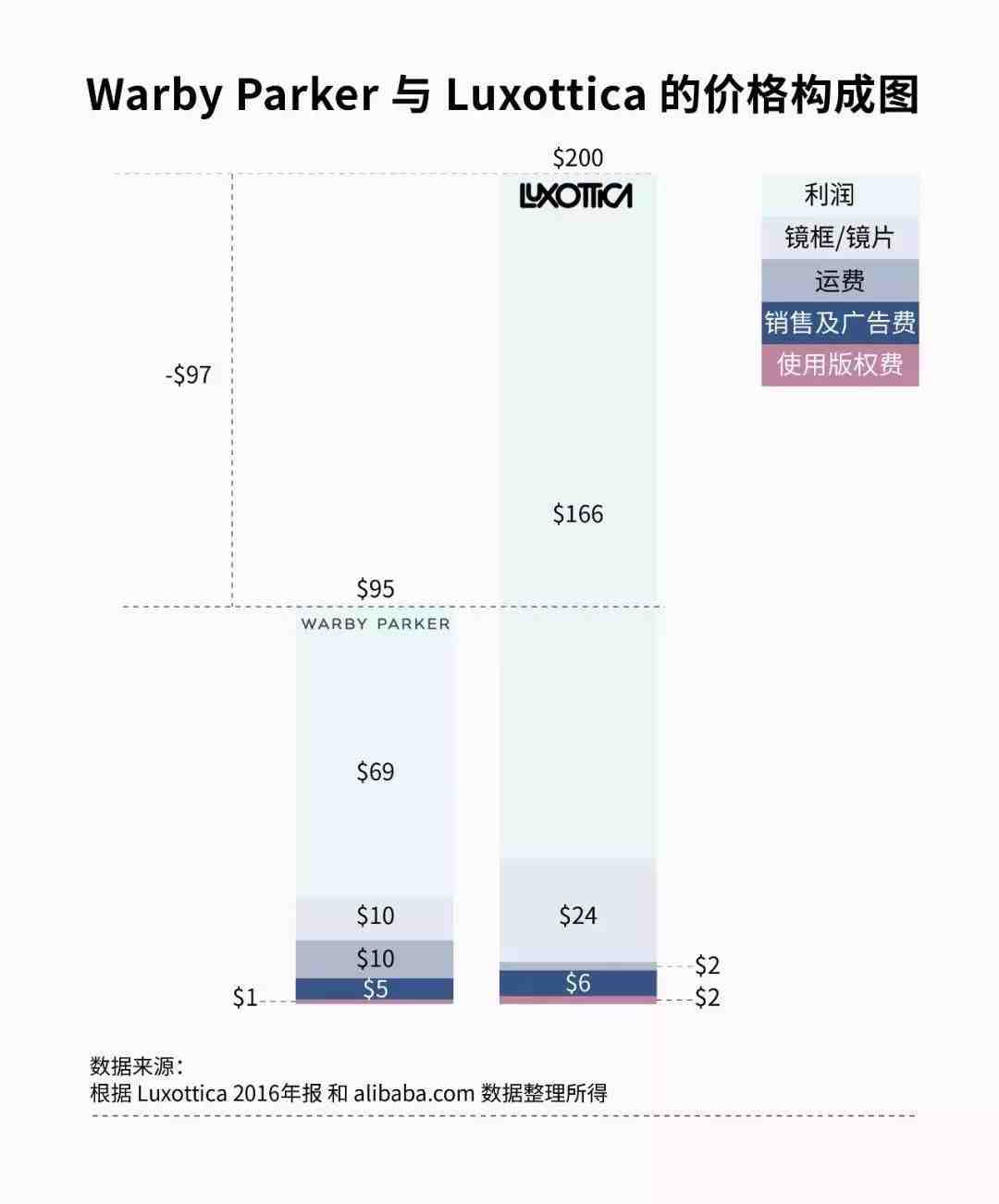 这点TIJN DTC模式和Warby Parker DTC模式一样,让我们来看一下Warby Parker与Luxottica价格构成图,对比光学新零售DTC品牌和传统眼镜巨头的价格。