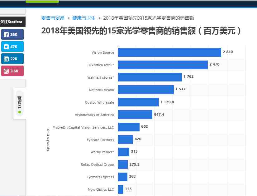 让我们再来看看,2018年美国领先的15家光学零售商的销售额。
