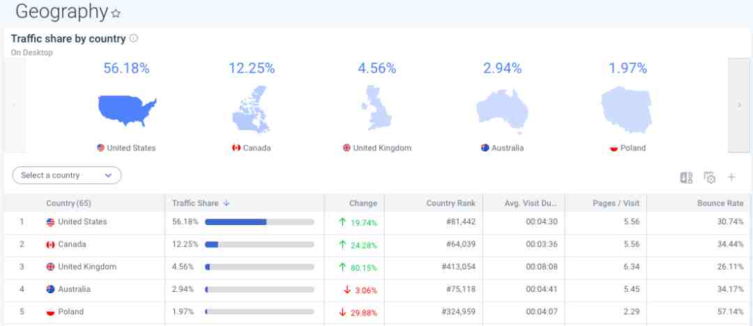 网站访问者来自全球65个国家,主要分布在美国,占总浏览人数的56.18%。其次是加拿大,占总浏览人数的12.25%。值得一提的是,英国的用户近三个月人数增幅较大,且该国的流量平均访问时长达8分钟,跳出率26.11%,表现优异。TIJN品牌知名度短时间内不断提升,让全球更多的消费者了解并选择购买。