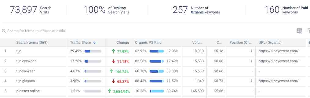 搜索部分还是以谷歌为主的常规搜索,小部分购物搜索和图片搜索。品牌相关的关键词的搜索占比达到61.02%,品牌知名度在互联网上已经打响,是DTC品牌的突出特点,当然还有一定的提升空间,但是表现已经很不错。关键词布局自然搜索257个,付费搜索160个,其中glasses online这个词的投入产出效果不错,可见TIJN的野心和目标,在海外眼镜线上市场占领一席之地。