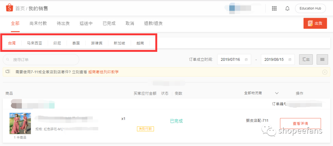 今天带大家认识下订单的各个状态,Shopee后台的订单有以下六种状态,所有状态下的订单都可通过Order ID(订单编号)搜索,还可以设置Order Ceration Date(订单创建时间)选择特定时间段的订单进行查看,也可以导出(Export)订单详情进行查看。