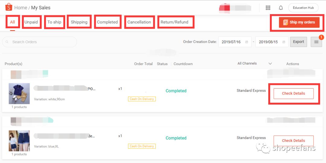 All(所有订单):点击可以查看店铺所有订单,包括退款或已取消的订单。