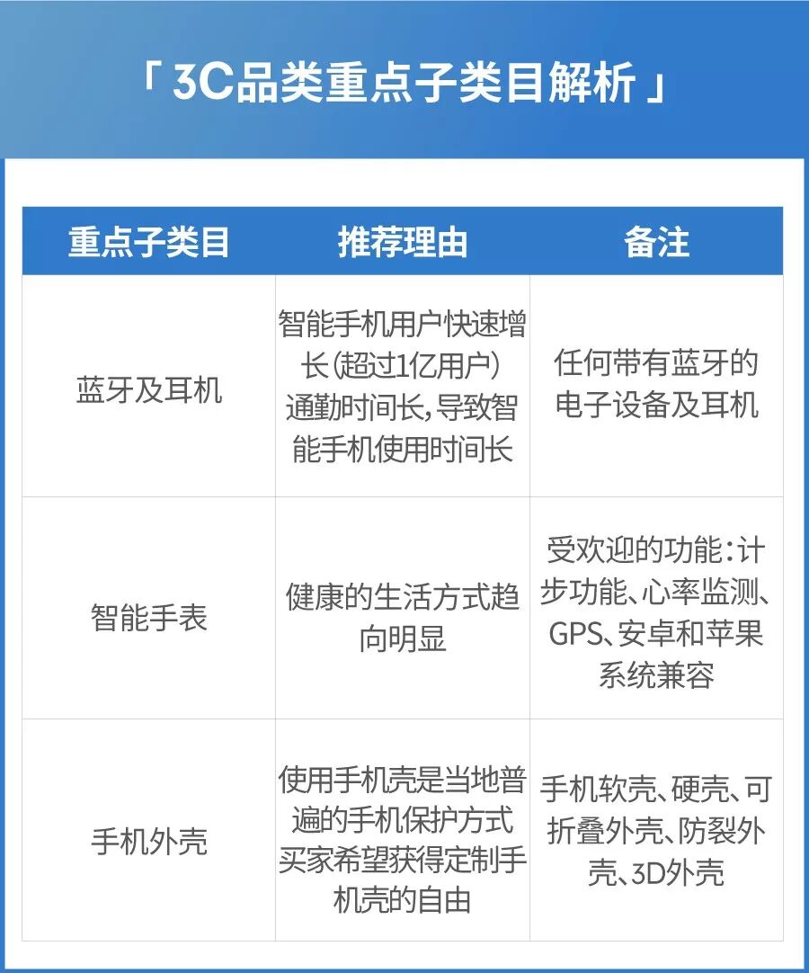 印尼智能手机用户增长迅速,安卓机占到80%的市场份额,因此安卓配件卖得更好。健康的生活方式趋向明显,更偏爱带有健康辅助功能(计步、心率监测、GPS等)的智能手表。使用手机壳是当地普遍的手机保护方法,可折叠外壳、防裂外壳、3D外壳等为畅销单品。