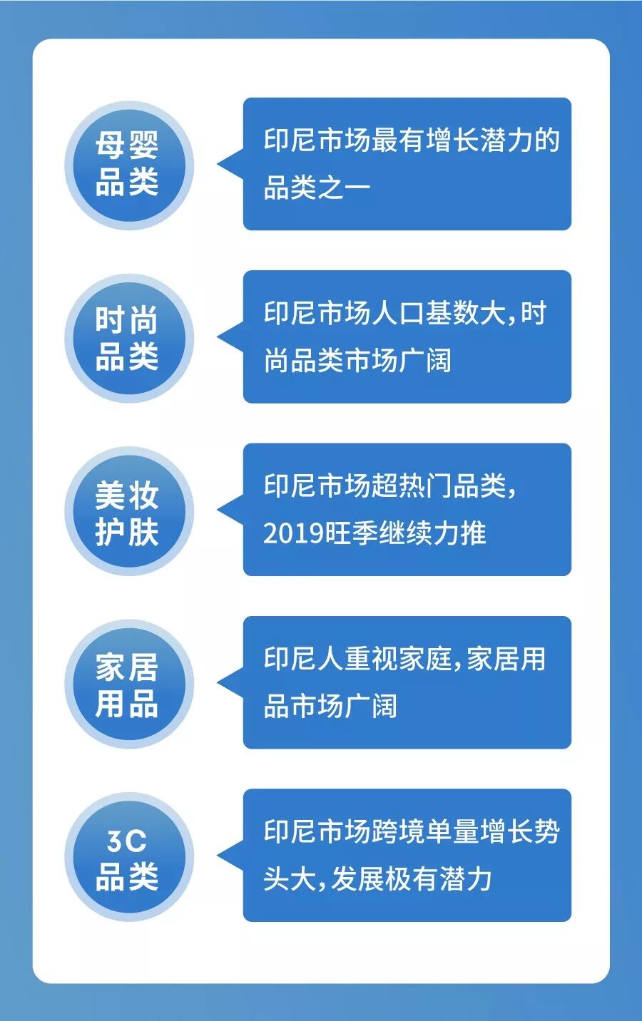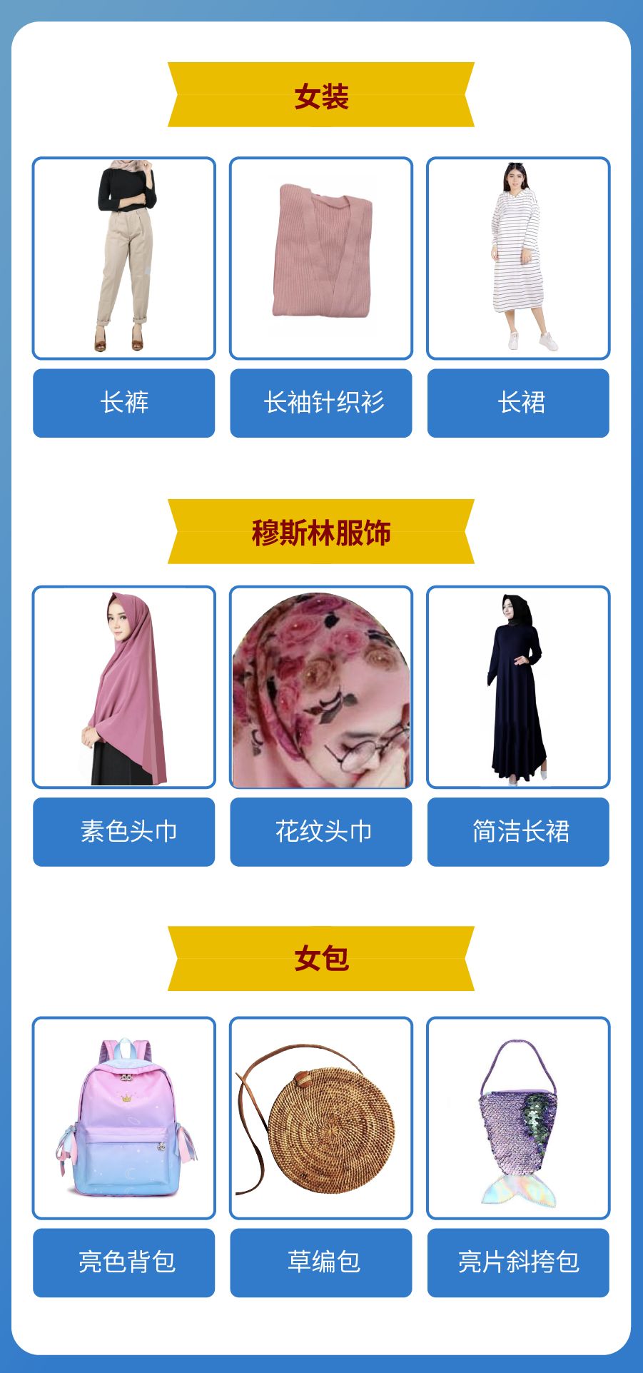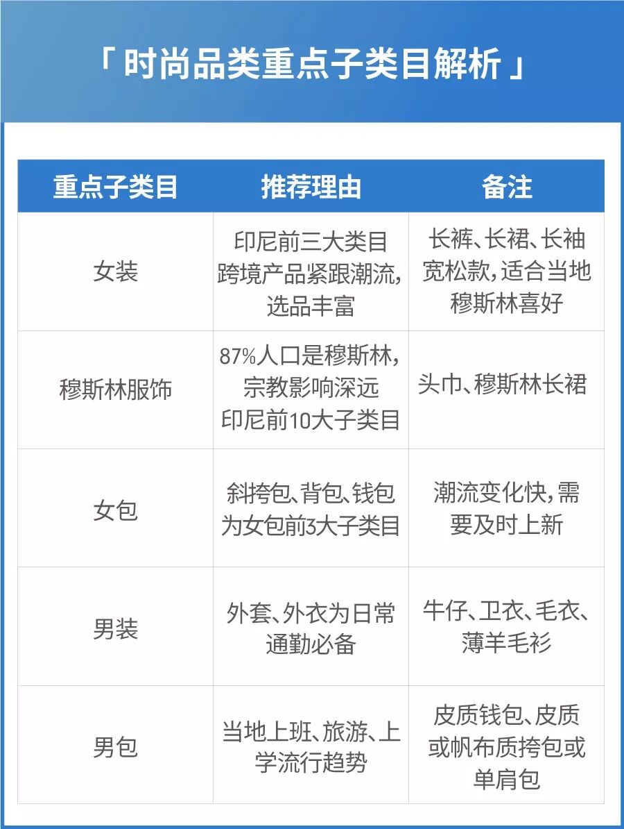 女装时尚类长裤、长裙、长袖宽松款适合当地穆斯林喜好。女包类潮流变化快,需要及时上新。男装时尚类外套、外衣和皮质钱包十分热销,是印尼男士日常通勤必备。皮质或者帆布材质挎包、单肩包是当地男生旅游时、上学时喜欢搭配的流行单品。