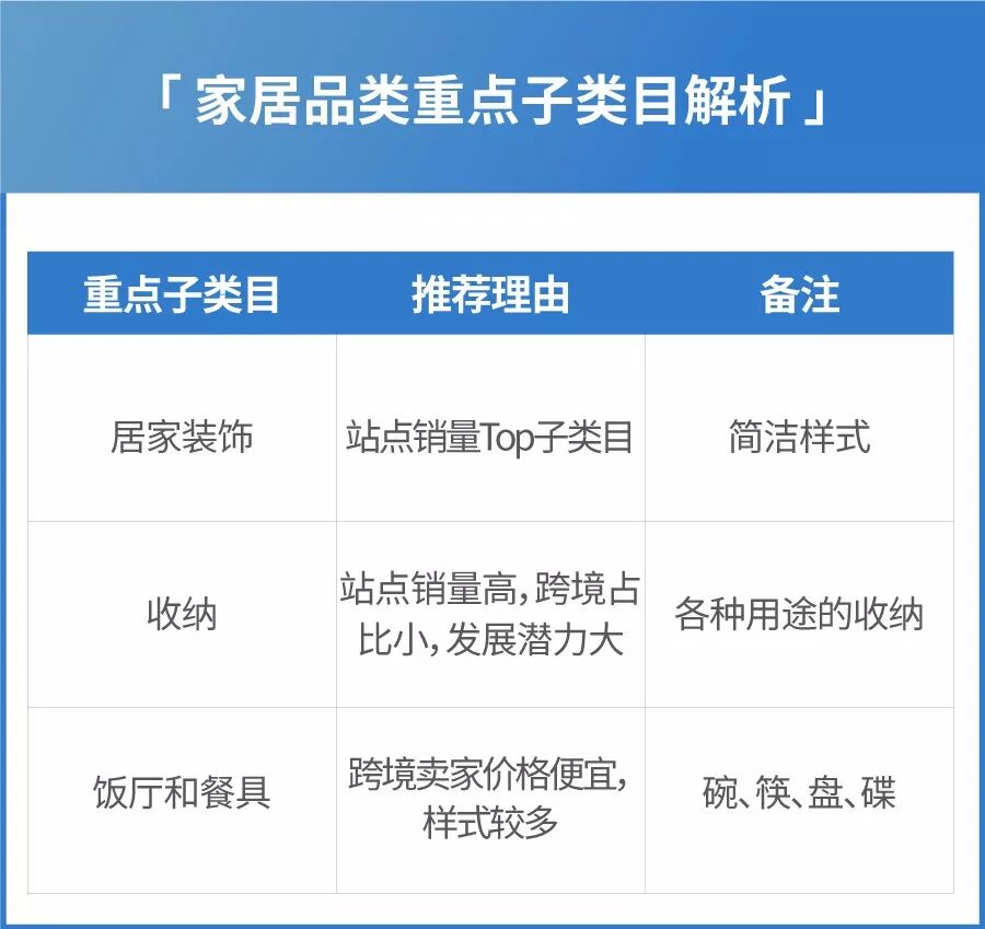 居家装饰类简洁、可爱款式颇受买家喜爱;收纳类各种用途的收纳都有很大的发展潜力,卖家们可开发更多好看又能装的收纳商品;餐厨类碗、筷、盘、碟商品出单快。