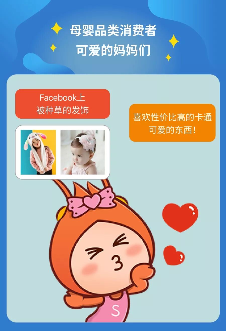 购物偏爱:妈妈们喜欢给孩子买各种卡通可爱造型款式。由于小孩所需产品更换速度快,偏爱打折产品,喜欢秒杀商品。(相信9.9大促她们都会疯狂剁手买买买!)