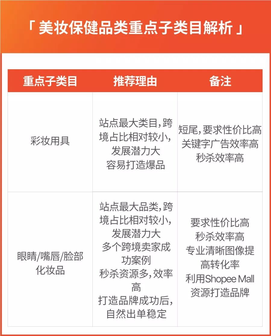 护肤美妆类商品秒杀效果好,卖家可通过清晰图像提高9.9大促转化率,并利用Shopee Mall资源打造品牌,品牌塑造成功后,大促爆单潜力大,日常出单数量稳定。