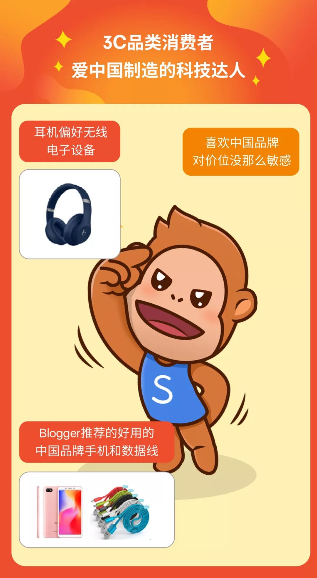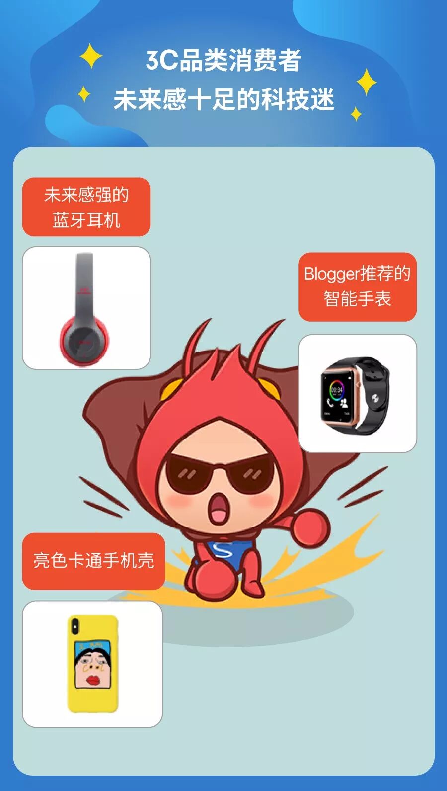 购物偏爱:喜欢使用未来感强(亚光色泽及灰、黑色)的蓝牙耳机、蓝牙音箱、智能手表,亮色、卡通图案手机壳与手机支架。
