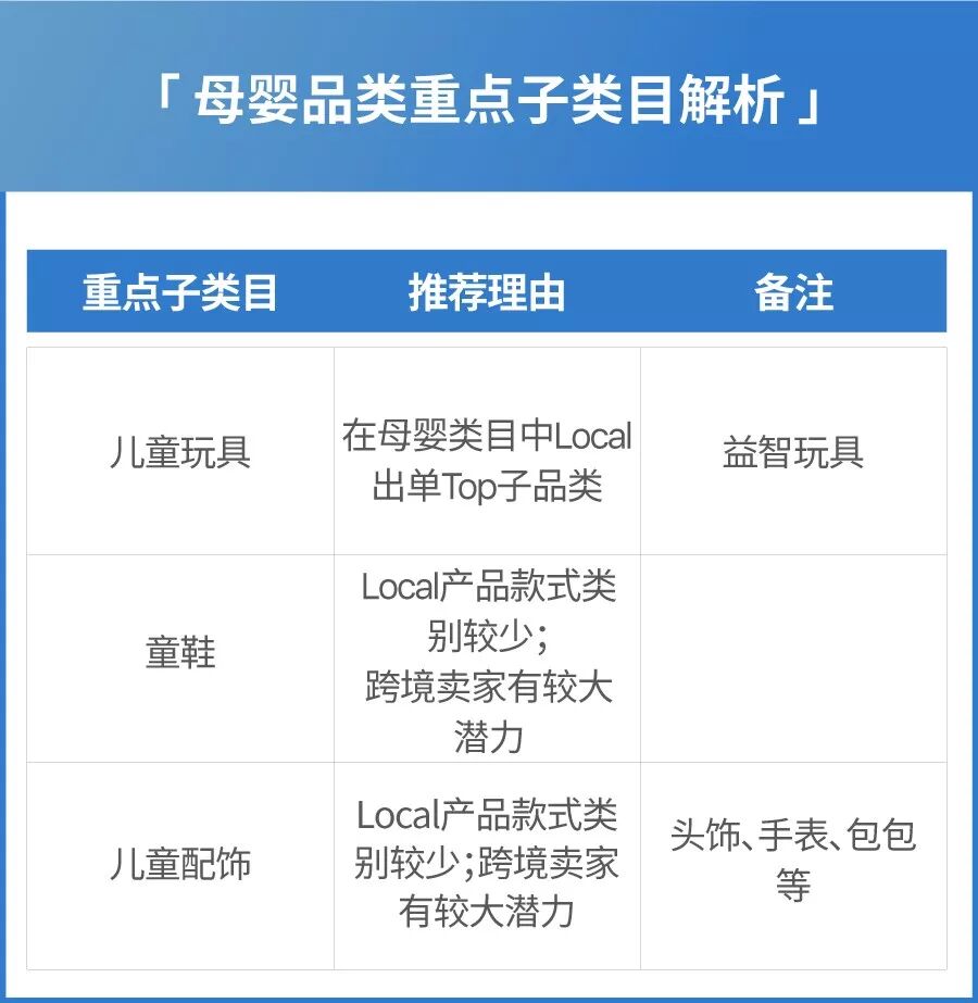 母婴用品的买家粘性高,垂直店铺更容易自然出单。买家对品牌没有要求,但对性价比有一定要求。玩具类益智玩具产品转化率高。童装与婴儿装为长尾品类,建议卖家们精准选择上架新品,同时低价位商品可以通过上秒杀位进行引流。