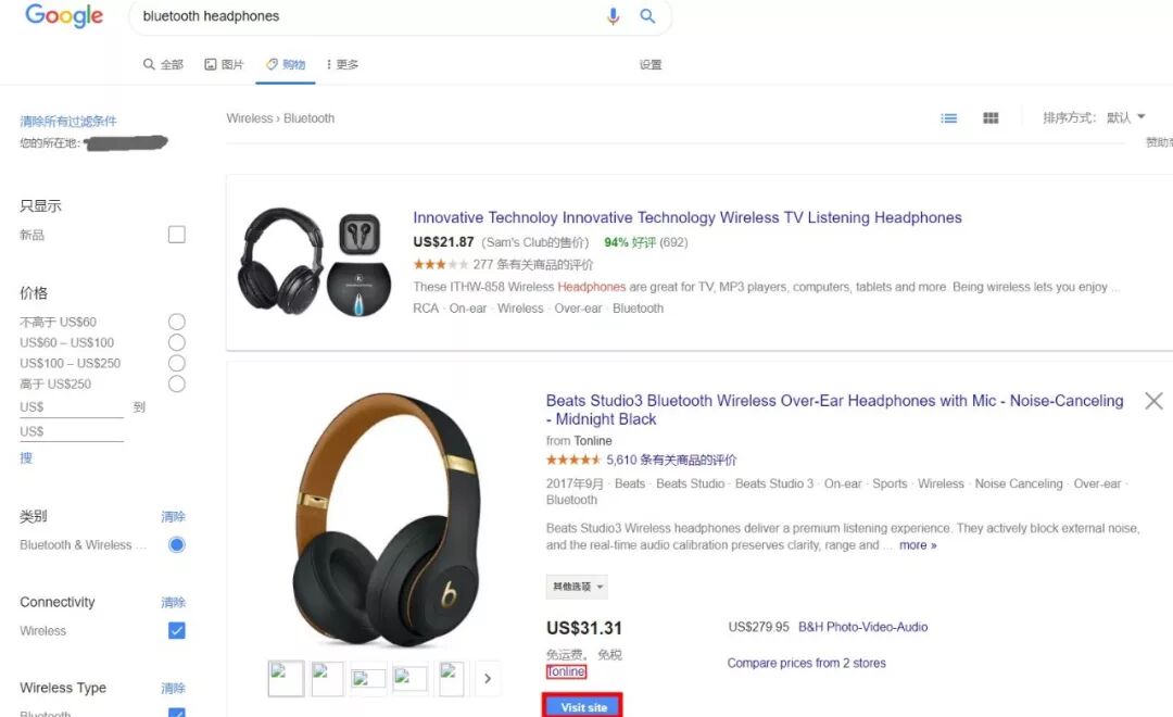 小编随手在谷歌购物里搜了头戴式蓝牙耳机,排名第二的、红框标记的就是某中国卖家利用Shopify做的独立站的产品https://www.tonline.store/。谷歌广告的计费模式比较多,但最多的还是按点击次数计费。