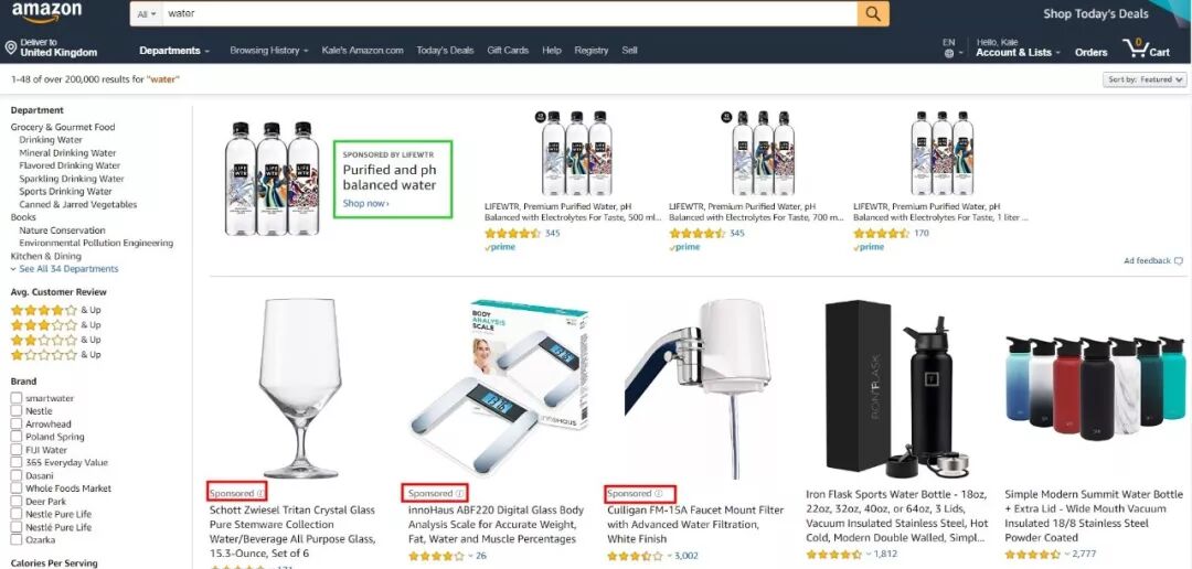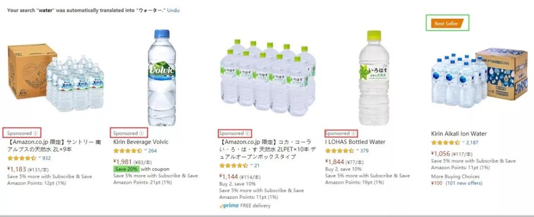 小编在日亚随手搜索了“water”,商品列表前四个都是赞助商产品“Sponsored Ads”——红色方框标出,第五个是Best seller,竞争激烈程度可见一斑!