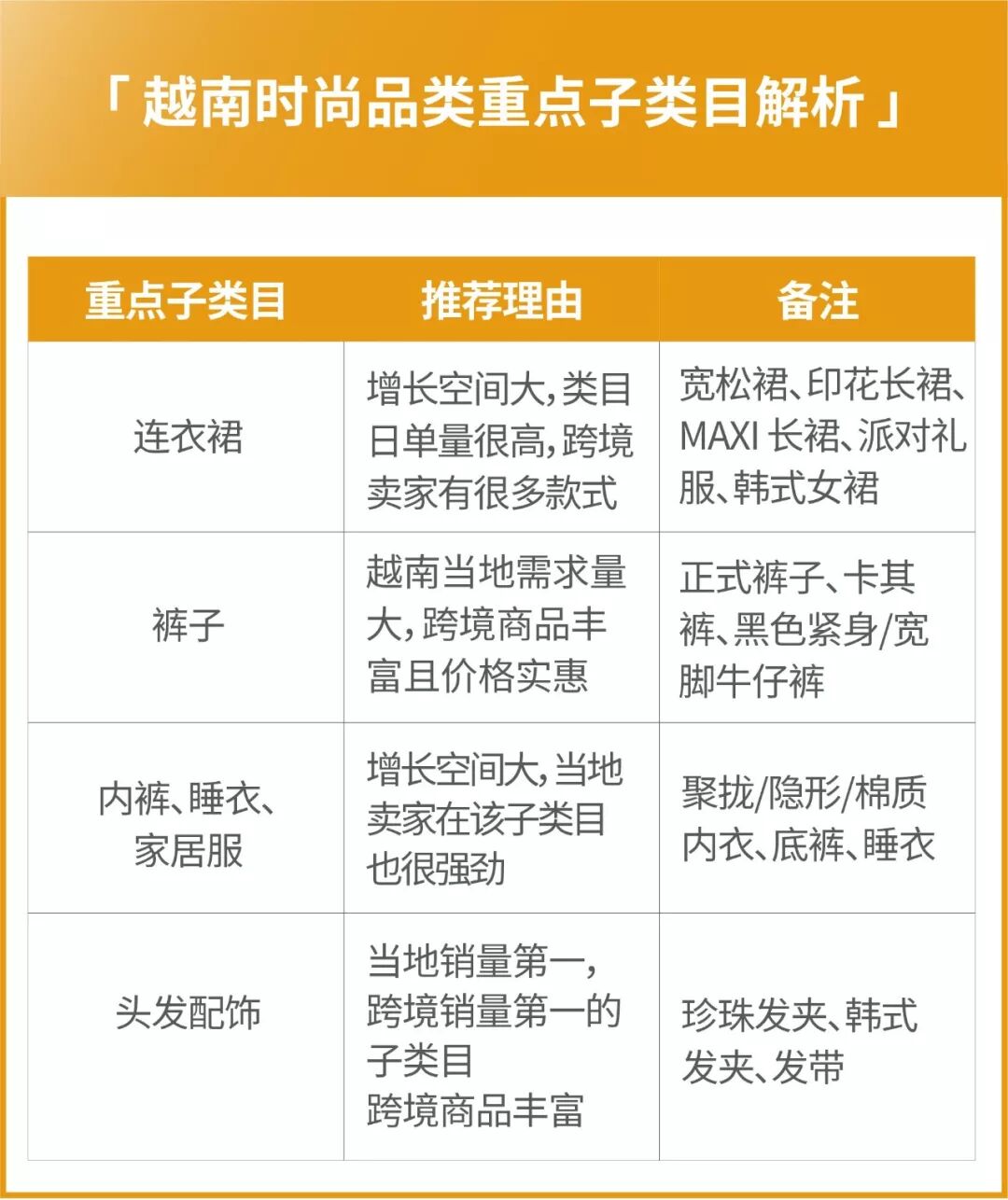 越南市场时尚品类风格偏韩风,小清新、可爱风格销量也很好。越南很多女性会骑摩托车,同时注重防晒,所以长裤、长裙也卖得很好。越南和其他东南亚市场不同一点是越南有一定的季节变化,尤其是北部,所以卖家朋友们注意快到秋冬时,可以考虑多多上新时髦秋冬装。