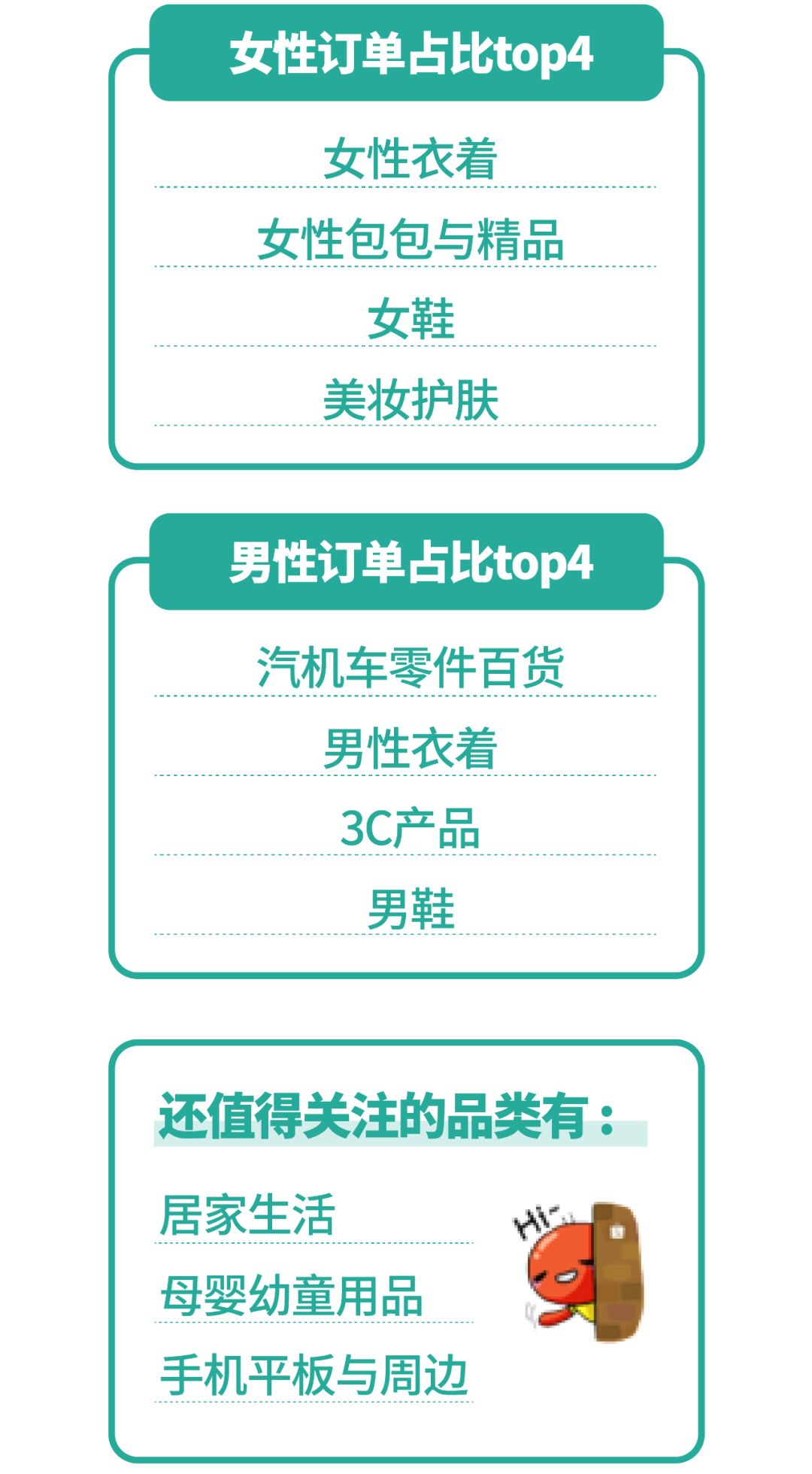 Shopee台湾市场不断挖掘男性潜力,男性订单增长势头强,订单占比Top 4为汽机车零件百货、男性衣着、3C产品和男鞋。9.9旺季大促,单量全线增长,居家生活、母婴幼童用品、手机平板与周边三大品类也具有极强爆单力。