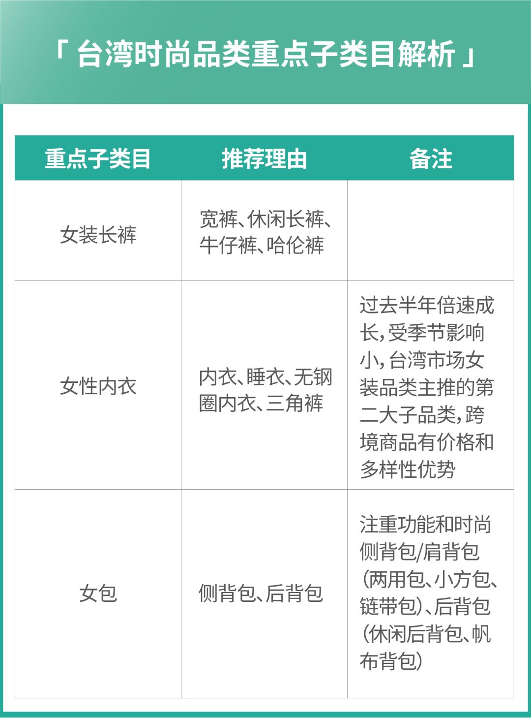 在台湾市场,女装品类最热卖子类目为上衣。长裤和内衣有上涨趋势和爆发潜力,韩系风格、日系风格都广受买家喜爱,宽裤和哈伦裤是热销时尚单品。女性内衣是台湾主推的子品类之一,跨境卖家有价格和多样性优势,可为9.9大促蓄力,提前上架商品并测试。女包部分买家注重时尚和功能,后背包和侧背包都是热销的子品类,卖家可多上新潮流新品。