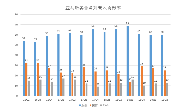 从2016年Q2至今,北美分部对营收增长的贡献率在60上下;国际分部对营收增长贡献率只有3个季度高于30%,2018年Q3仅为14%;AWS增速虽高但基数小对全局影响不大,更何况现在增速又降了下来。