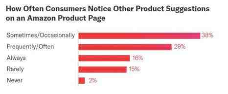 在亚马逊的广告中,listing页面内的广告有很多种类,具体位置就不详细举例了,那么这种listing页面内的广告的影响力究竟有多大?结果显示,只有16%的消费者总是会注意到这类广告,有29%的顾客经常会注意到,而有时注意或者不注意的消费者超过了一半,这也就说明了在站内的广告的选择上,还是要集中力量主攻搜索结果页面,而listing详情页面的广告只能起到锦上添花的作用。
