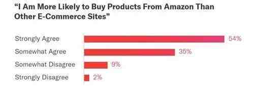 在被问及是否会选择亚马逊作为自己网上购物的第一选择时,有54%的人选择了坚决同意,有35%的人选择了部分同意,这说明在此次抽样调查中,有超过89%的消费者把亚马逊作为其网络购物的第一选择,这再次说明了亚马逊的市场占有率的不断升高,亚马逊作为电子商务巨头的地位在不断增强。
